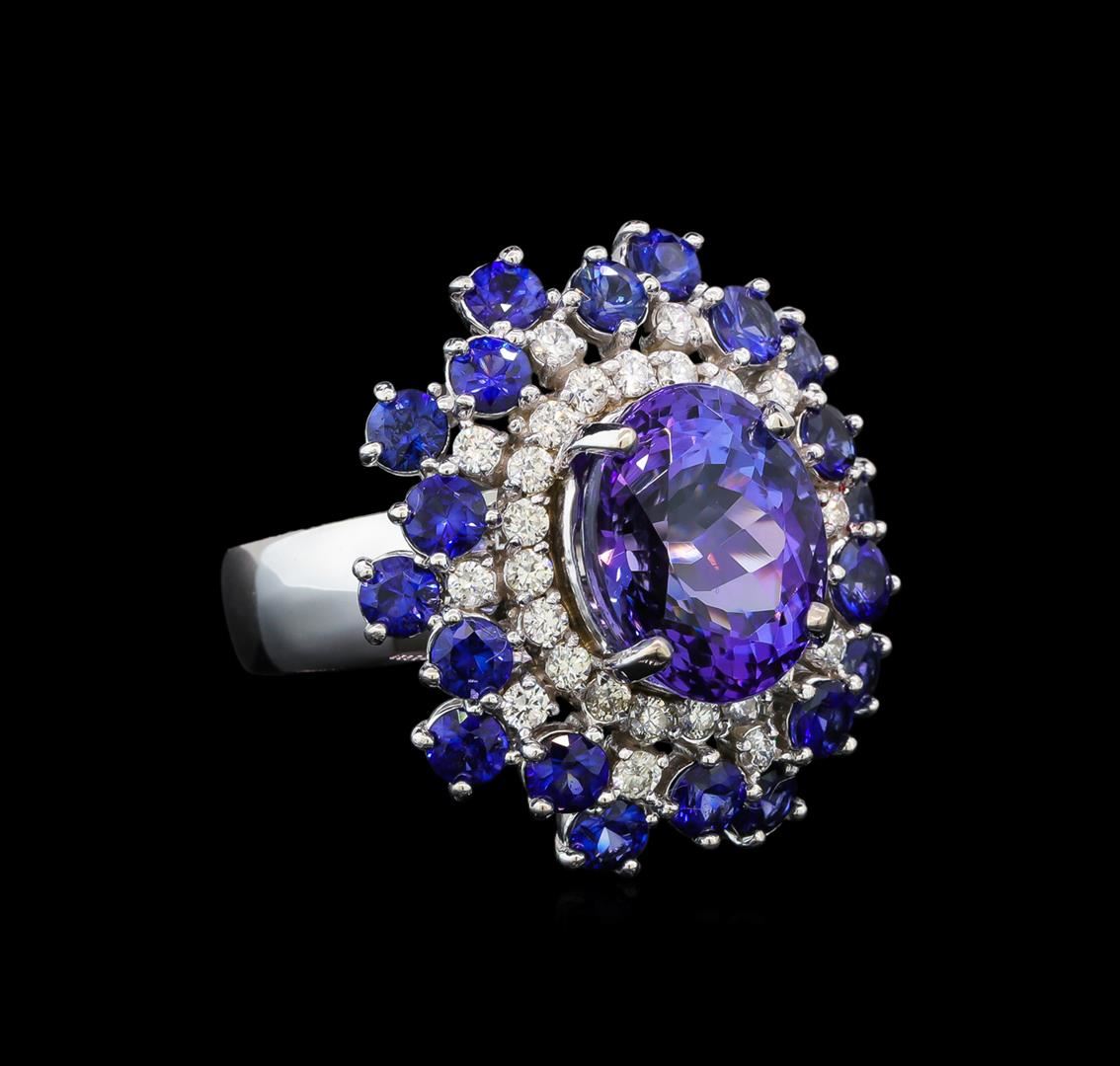 One electronically tested 14KT white gold ladies cast tanzanite, sapphire and diamond ring with a bright polish finish. Identified with markings of "K14". Condition is new. Containing: One prong set oval modified brilliant cut natural tanzanite, measuring 11.84 x 9.54 x 6.20mm, approximate weight of 4.93ct., clarity is eye clean, type I, light, very slightly grayish, violet color, (GIA V 3/3), cut is good. Twenty prong set round modified brilliant cut natural blue sapphires, measuring 3.00 - 2.50 x 1.79 mm, approximate. Total Weight of 2.60 ct., clarity is eye clean, type II, medium, moderately strong, blue color, (GIA B 5/4), cut is good. Thirty prong set round brilliant cut diamonds, measuring 1.60 - 1.50 x 0.93mm (depth est.) approximate. Total Weight of 30 Stones = 0.41ct. Clarity: SI-2 to I-1. Color: H - I, Cut is Good. Colored gemstones are presumed to have been subjected to commonly used enhancement processes. All diamonds and colored gemstones are graded in the mounting, unless otherwise stated. Total Weight of Colored Stones 7.53ct. Total Weight of Diamonds 0.41ct. Total Weight of Ring 12.30 grams. GGL Appraised.
