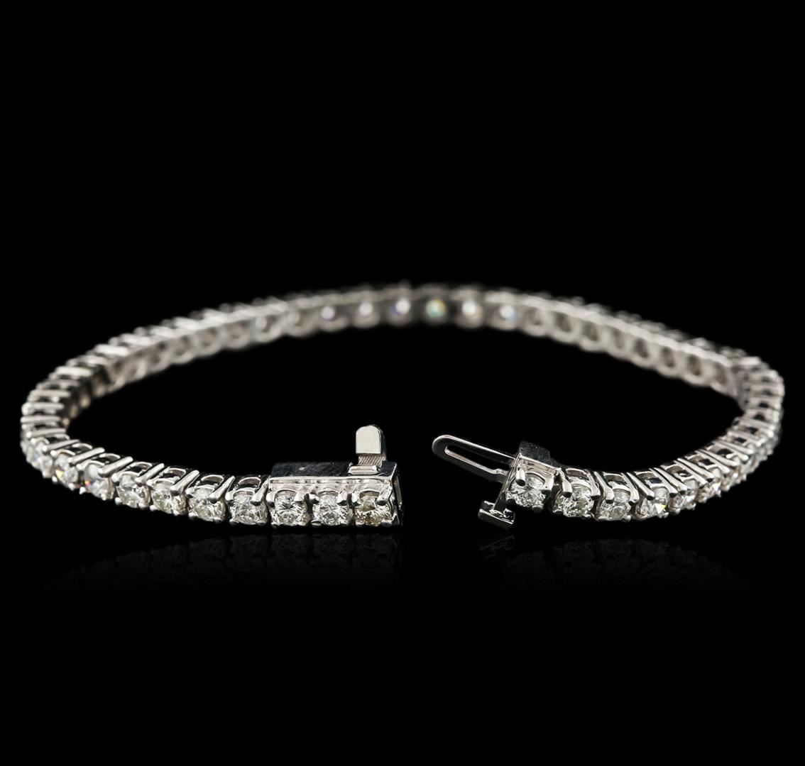 One electronically tested 14KT white gold ladies cast diamond tennis bracelet with a hidden box clasp with safety closer with a bright polish finish. Measurements: 7". Identified with markings of "14K". Condition is new. Containing: Fifty-Two prong set round brilliant cut diamonds, measuring 2.90 - 2.90 x 1.74mm (depth est.) approximate total weight of 52 Stones = 4.96ct. Clarity: SI-2 to I-2. Color: G - H, Cut is Good. Diamonds are graded in the mounting, unless otherwise stated. Total Weight of Diamonds 4.96ct. Total Weight of Tennis Bracelet 14.00 grams. GGL Appraised at $10,225.00.