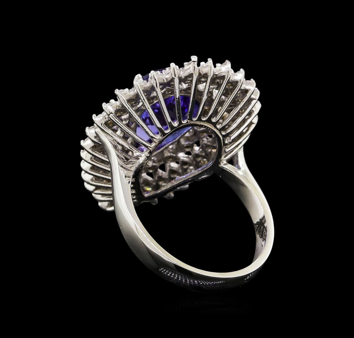 One electronically tested 14KT white gold ladies cast tanzanite and diamond ring with a bright polish finish. Identified with markings of "K14". Condition is new. Containing: One prong set pear modified brilliant cut natural tanzanite, measuring 13.60 x 8.60 x 6.33mm, approximate weight of 4.96ct., clarity is eye clean, type I, medium light, very slightly grayish, violet color, (GIA V 4/3), cut is good. One Hundred Two prong set round brilliant cut diamonds, measuring 1.50 - 1.30 x 0.84mm (depth est.) approximate total weight of 102 Stones = 1.02ct. Clarity: SI-2 to I-2. Color: J, Cut is Good. Colored gemstones are presumed to have been subjected to commonly used enhancement processes. All diamonds and colored gemstones are graded in the mounting, unless otherwise stated. Total Weight of Colored Stones 4.96ct. Total Weight of Diamonds 1.02ct. Total Weight of Ring 9.10 grams. GGL Appraised at $6,625.00.