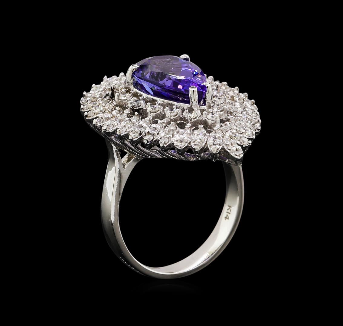 One electronically tested 14KT white gold ladies cast tanzanite and diamond ring with a bright polish finish. Identified with markings of "K14". Condition is new. Containing: One prong set pear modified brilliant cut natural tanzanite, measuring 13.60 x 8.60 x 6.33mm, approximate weight of 4.96ct., clarity is eye clean, type I, medium light, very slightly grayish, violet color, (GIA V 4/3), cut is good. One Hundred Two prong set round brilliant cut diamonds, measuring 1.50 - 1.30 x 0.84mm (depth est.) approximate total weight of 102 Stones = 1.02ct. Clarity: SI-2 to I-2. Color: J, Cut is Good. Colored gemstones are presumed to have been subjected to commonly used enhancement processes. All diamonds and colored gemstones are graded in the mounting, unless otherwise stated. Total Weight of Colored Stones 4.96ct. Total Weight of Diamonds 1.02ct. Total Weight of Ring 9.10 grams. GGL Appraised at $6,625.00.