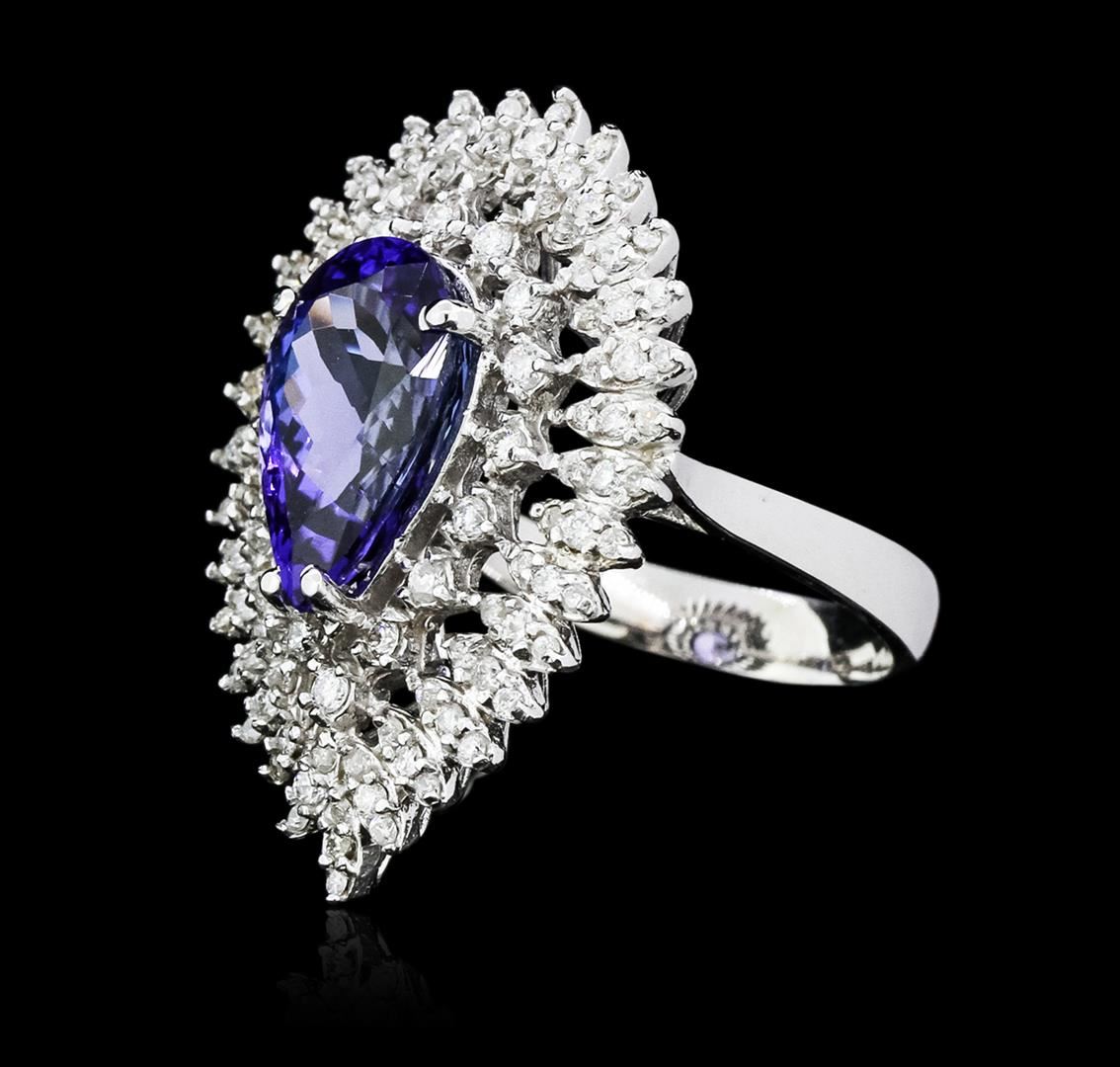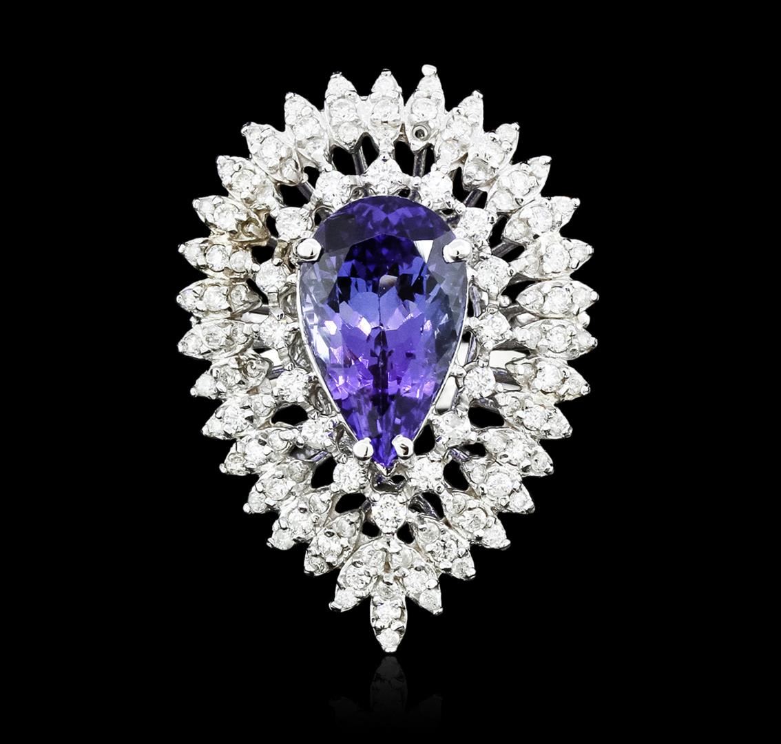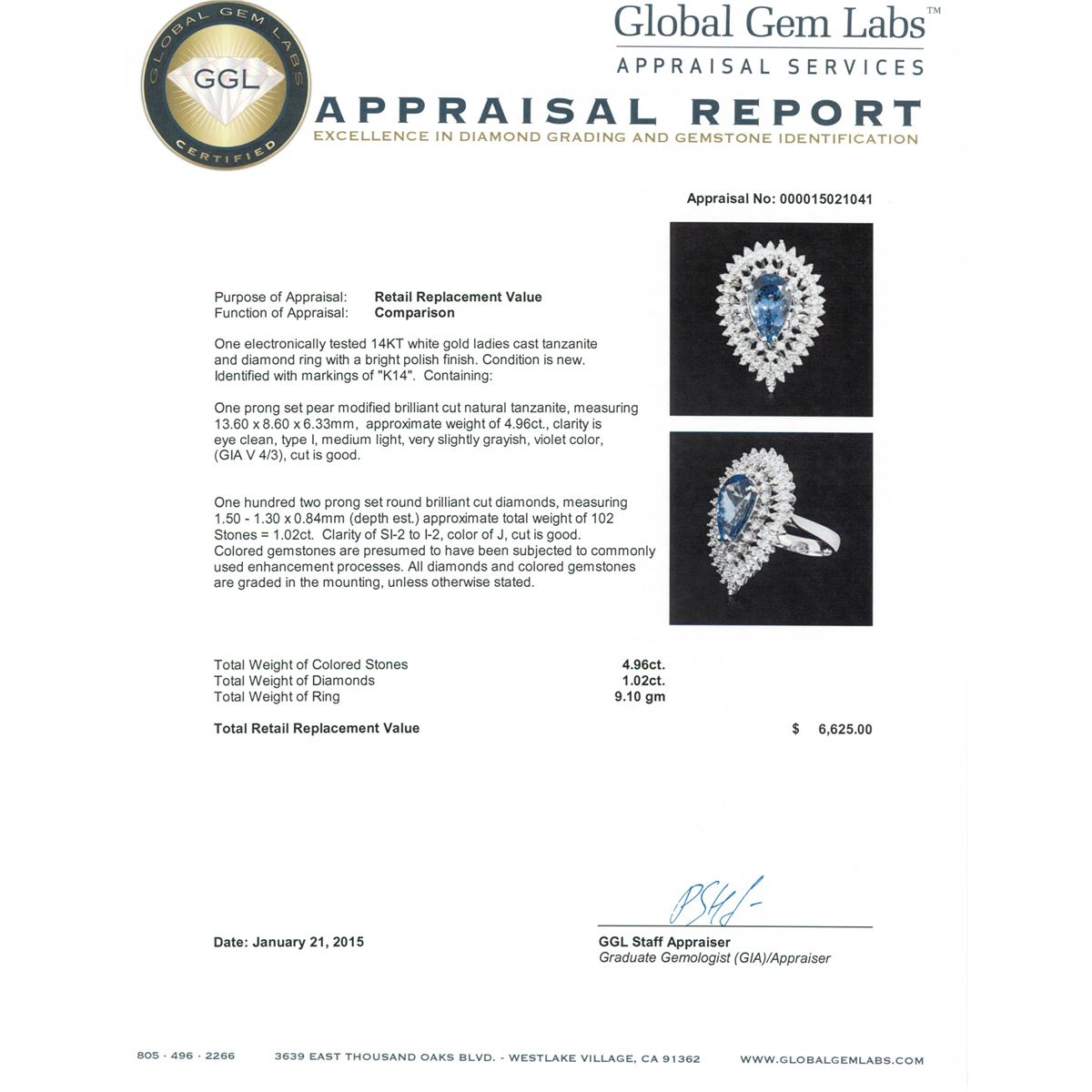 One electronically tested 14KT white gold ladies cast tanzanite and diamond ring with a bright polish finish. Identified with markings of "K14". Condition is new. Containing: One prong set pear modified brilliant cut natural tanzanite, measuring 13.60 x 8.60 x 6.33mm, approximate weight of 4.96ct., clarity is eye clean, type I, medium light, very slightly grayish, violet color, (GIA V 4/3), cut is good. One Hundred Two prong set round brilliant cut diamonds, measuring 1.50 - 1.30 x 0.84mm (depth est.) approximate total weight of 102 Stones = 1.02ct. Clarity: SI-2 to I-2. Color: J, Cut is Good. Colored gemstones are presumed to have been subjected to commonly used enhancement processes. All diamonds and colored gemstones are graded in the mounting, unless otherwise stated. Total Weight of Colored Stones 4.96ct. Total Weight of Diamonds 1.02ct. Total Weight of Ring 9.10 grams. GGL Appraised at $6,625.00.