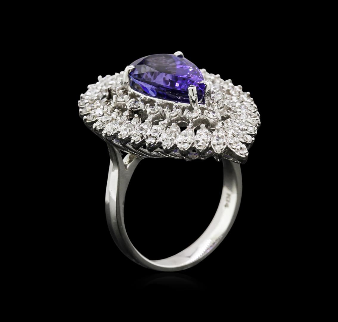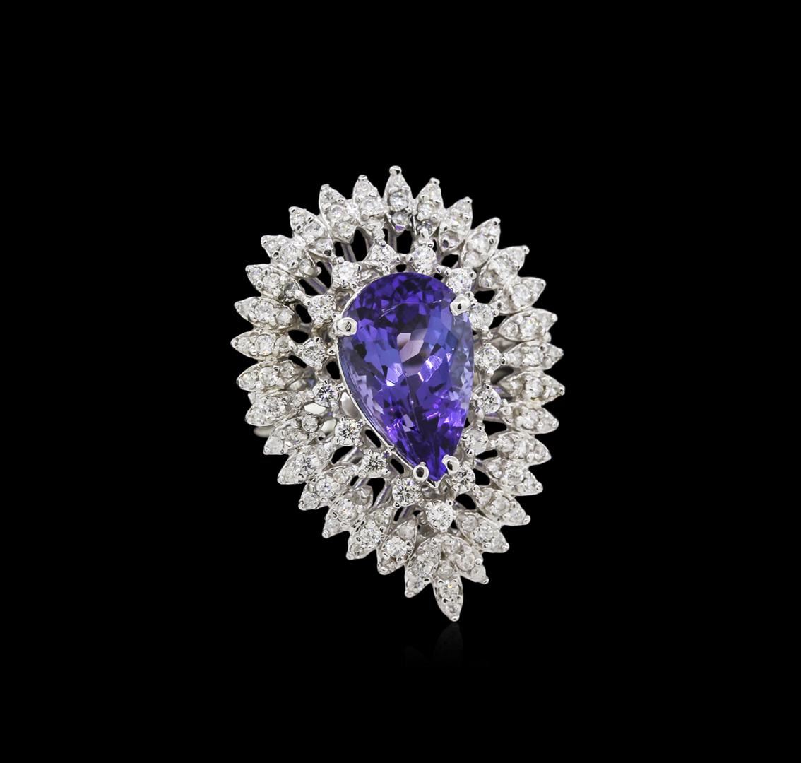One electronically tested 14KT white gold ladies cast tanzanite and diamond ring with a bright polish finish. Identified with markings of "K14". Condition is new. Containing: One prong set pear modified brilliant cut natural tanzanite, measuring 13.60 x 8.60 x 6.33mm, approximate weight of 4.96ct., clarity is eye clean, type I, medium light, very slightly grayish, violet color, (GIA V 4/3), cut is good. One Hundred Two prong set round brilliant cut diamonds, measuring 1.50 - 1.30 x 0.84mm (depth est.) approximate total weight of 102 Stones = 1.02ct. Clarity: SI-2 to I-2. Color: J, Cut is Good. Colored gemstones are presumed to have been subjected to commonly used enhancement processes. All diamonds and colored gemstones are graded in the mounting, unless otherwise stated. Total Weight of Colored Stones 4.96ct. Total Weight of Diamonds 1.02ct. Total Weight of Ring 9.10 grams. GGL Appraised at $6,625.00.