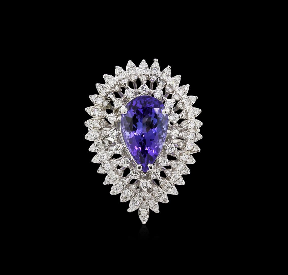 One electronically tested 14KT white gold ladies cast tanzanite and diamond ring with a bright polish finish. Identified with markings of "K14". Condition is new. Containing: One prong set pear modified brilliant cut natural tanzanite, measuring 13.60 x 8.60 x 6.33mm, approximate weight of 4.96ct., clarity is eye clean, type I, medium light, very slightly grayish, violet color, (GIA V 4/3), cut is good. One Hundred Two prong set round brilliant cut diamonds, measuring 1.50 - 1.30 x 0.84mm (depth est.) approximate total weight of 102 Stones = 1.02ct. Clarity: SI-2 to I-2. Color: J, Cut is Good. Colored gemstones are presumed to have been subjected to commonly used enhancement processes. All diamonds and colored gemstones are graded in the mounting, unless otherwise stated. Total Weight of Colored Stones 4.96ct. Total Weight of Diamonds 1.02ct. Total Weight of Ring 9.10 grams. GGL Appraised at $6,625.00.