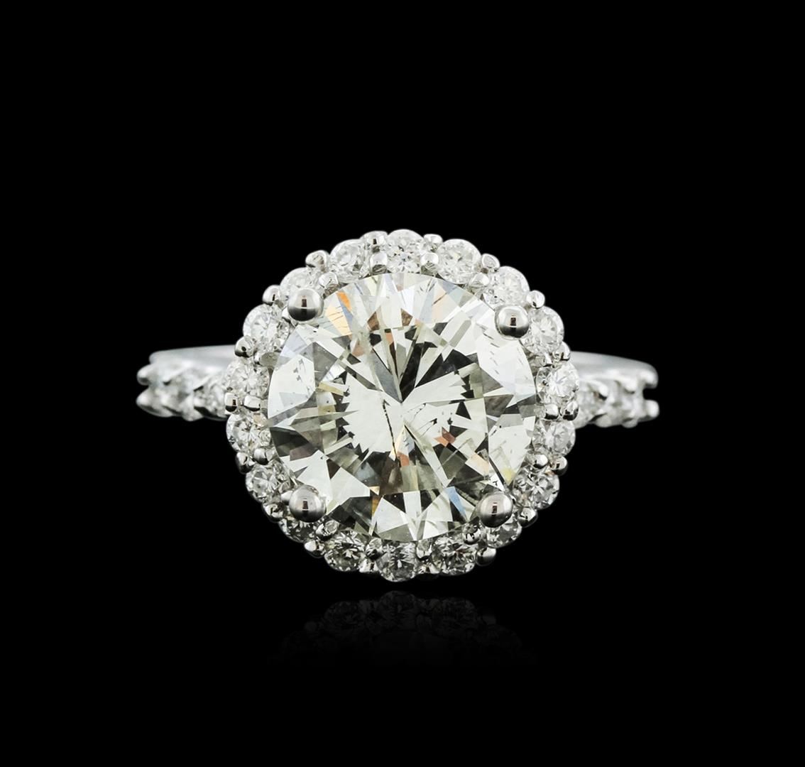 One electronically tested 14KT white gold ladies cast diamond unity ring with a bright polish finish. The featured diamond is set within a diamond bezel supported by diamond set shoulders, completed by a two millimeter wide band. Identified with markings of "14K 585". Condition is new, good workmanship. Containing: One prong set round brilliant cut diamond, measuring 9.99 - 10.02 x 6.50mm (depth est.), 8.00.%. GTCF approximate weight of 4.29ct with a medium blue fluorescence. Diamond Grading Report attached. Graded in the setting. Clarity: I-1. Color: K. Depth 64.9%. Table 67.9%. Twenty-Four prong set round brilliant cut diamonds, measuring 2.00 - 1.80 x 1.14mm (depth est.) approximate total weight of 24 Stones = 0.70ct. Graded in the setting. Clarity: SI-1 to I-1. Color: G - I. Total Weight of Diamonds 4.99ct. Total Weight of Ring 5.47 grams. AIG Appraised at $65,310.00.