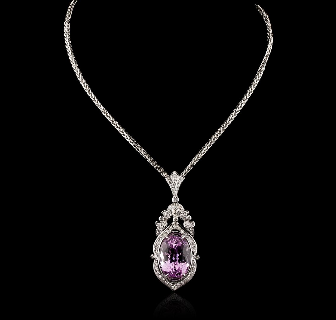 One electronically tested 14KT white gold ladies cast & assembled kunzite and diamond pendant with chain. The pendant features a kunzite set within a stylized diamond frame, completed by a diamond set bail. The pendant is supported by an eighteen inch length 14KT white gold designer style chain, terminating in a lobster claw clasp. Bright polish finish. Identified with markings of "K14". Condition is new, good workmanship. Containing: One prong set oval mixed cut natural kunzite, measuring 22.70 x 17.30 x 14.05mm, 12% bulge factor, approximate weight of 40.03ct., clarity is eye clean, type I, medium light, very slightly grayish, reddish purple color, (GIA rP 4/3), cut is good. Transmitting light with no distortion, transparent. Colored Stone Grading Report attached. Graded in the setting. Sixty-Six prong and bezel set round brilliant cut diamonds, measuring 2.50 - 2.00 x 1.35mm (depth est.) approximate total weight of 66 Stones = 2.84ct. Graded in the setting. Clarity: VS-2 to SI-1. Color: H - J. Total Weight of Colored Stones 40.03ct. Total Weight of Diamonds 2.84ct. Total Weight of Pendant With Chain 30.71 grams. AIG Appraised at $24,095.00.