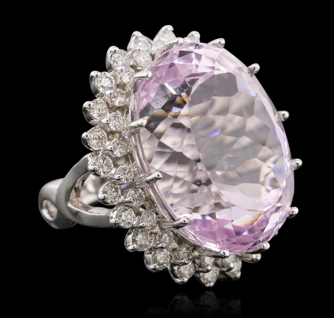 One electronically tested 14KT white gold ladies cast kunzite and diamond ring with a bright polish finish. Condition is new, good workmanship. The featured kunzite is set within a two tiered diamond bezel supported by intertwining shoulders, completed by a two and one-half millimeter wide band. Identified with markings of "K14". Containing: One prong set oval modified brilliant cut natural kunzite, measuring 22.77 x 17.41 x 14.28mm, exact weight 40.04ct, type I clarity is eye clean, medium, very slightly grayish, pink-purple, (GIA PiP 5/3), cut is good. Transmitting light with no distortion, transparent. GIA Gemological Report attached. Graded loose prior to setting in the GIA Laboratory, Report # 1156952117. Twenty-four prong set round brilliant cut diamonds, measuring 2.40 - 2.30 x 1.41mm (depth est.) approximate total weight of 24 Stones = 1.24ct. Graded in the setting. Clarity SI-1 to I-1 Color G-I. Twenty-four prong set round brilliant cut diamonds, measuring 1.90 - 1.80 x 1.11mm (depth est.) approximate total weight of 24 Stones = 0.65ct. Graded in the setting. Clarity SI-1 to I-1 Color G-I. Total Weight of Colored Stones 40.04ct. Total Weight of Diamonds 1.89ct. Total Weight of Ring 18.22 grams. AIG Appraised at $19,250.00.
