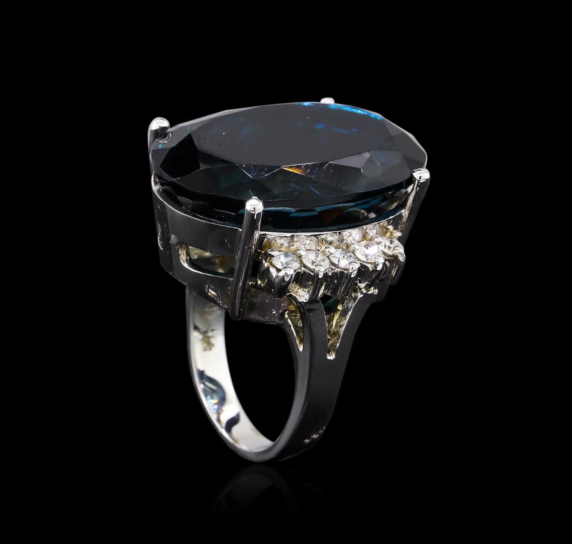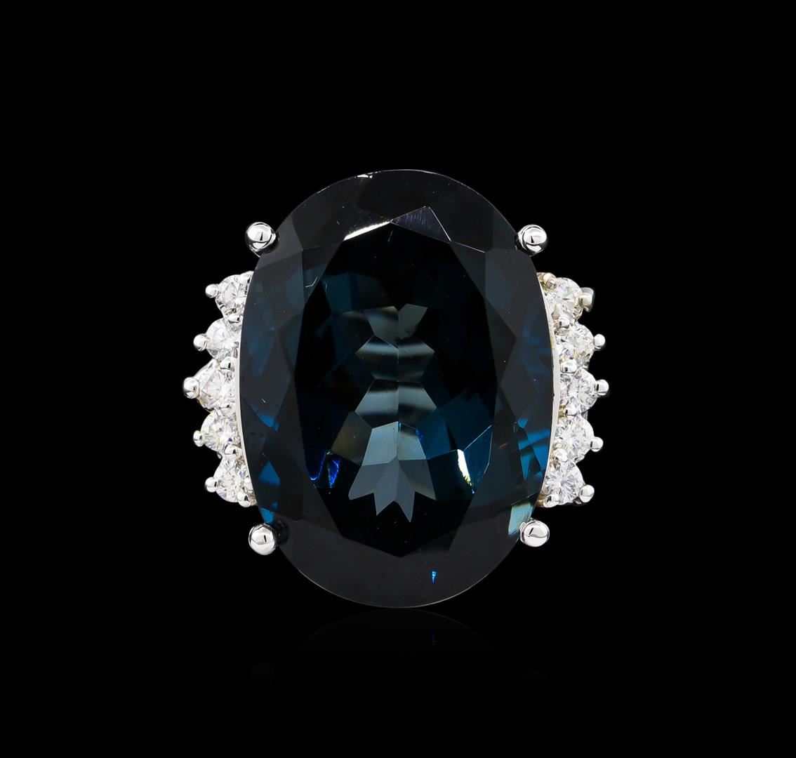 One electronically tested 14KT white gold Ladies cast ring with a bright polish finish. Condition is new. Identified with markings of "K14". Containing: One prong set oval modified brilliant cut natural blue topaz, measuring 25.22 x 18.03 x 12.30mm, approximate weight of 40.61ct., clarity is eye clean, type I, medium light, very slightly grayish, greenish blue color, (GIA gB 4/3), cut is very good. Colored gemstones are presumed to have been subjected to commonly used color/clarity enhancement processes. Ten prong set round brilliant cut diamonds, measuring 3.00 - 3.00 x 1.80mm (depth est.) approximate. Total Weight of 10 Stones = 0.99ct. Clarity: I-1 to I-2. Color: I - J, Cut is Good. Total Weight of Colored Stones 40.61ct. Total Weight of Diamonds 0.99ct. Total Weight of Ring 19.80 Grams. GGL Appraised.