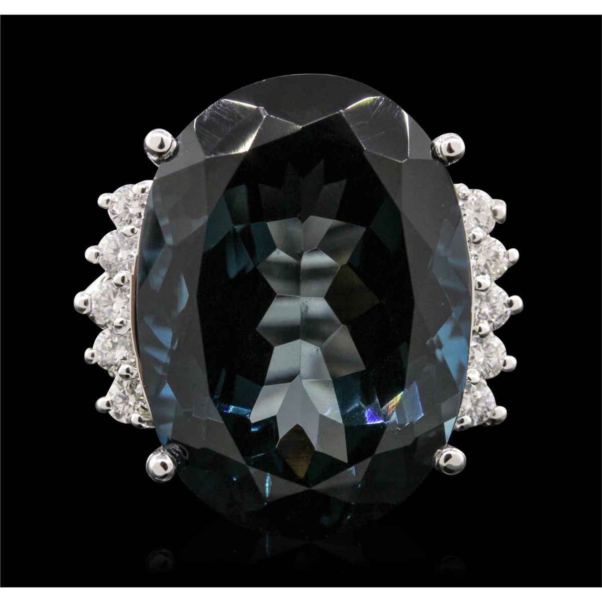 One electronically tested 14KT white gold Ladies cast ring with a bright polish finish. Condition is new. Identified with markings of "K14". Containing: One prong set oval modified brilliant cut natural blue topaz, measuring 25.22 x 18.03 x 12.30mm, approximate weight of 40.61ct., clarity is eye clean, type I, medium light, very slightly grayish, greenish blue color, (GIA gB 4/3), cut is very good. Colored gemstones are presumed to have been subjected to commonly used color/clarity enhancement processes. Ten prong set round brilliant cut diamonds, measuring 3.00 - 3.00 x 1.80mm (depth est.) approximate. Total Weight of 10 Stones = 0.99ct. Clarity: I-1 to I-2. Color: I - J, Cut is Good. Total Weight of Colored Stones 40.61ct. Total Weight of Diamonds 0.99ct. Total Weight of Ring 19.80 Grams. GGL Appraised at $9,435.00.