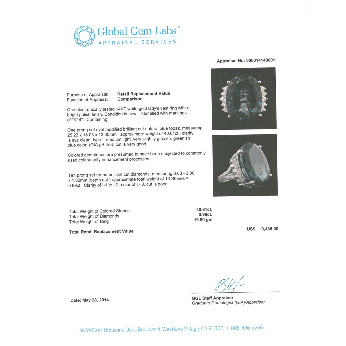 One electronically tested 14KT white gold Ladies cast ring with a bright polish finish. Condition is new. Identified with markings of "K14". Containing: One prong set oval modified brilliant cut natural blue topaz, measuring 25.22 x 18.03 x 12.30mm, approximate weight of 40.61ct., clarity is eye clean, type I, medium light, very slightly grayish, greenish blue color, (GIA gB 4/3), cut is very good. Colored gemstones are presumed to have been subjected to commonly used color/clarity enhancement processes. Ten prong set round brilliant cut diamonds, measuring 3.00 - 3.00 x 1.80mm (depth est.) approximate. Total Weight of 10 Stones = 0.99ct. Clarity: I-1 to I-2. Color: I - J, Cut is Good. Total Weight of Colored Stones 40.61ct. Total Weight of Diamonds 0.99ct. Total Weight of Ring 19.80 Grams. GGL Appraised at $9,435.00.