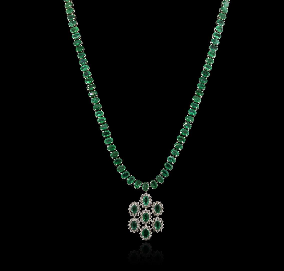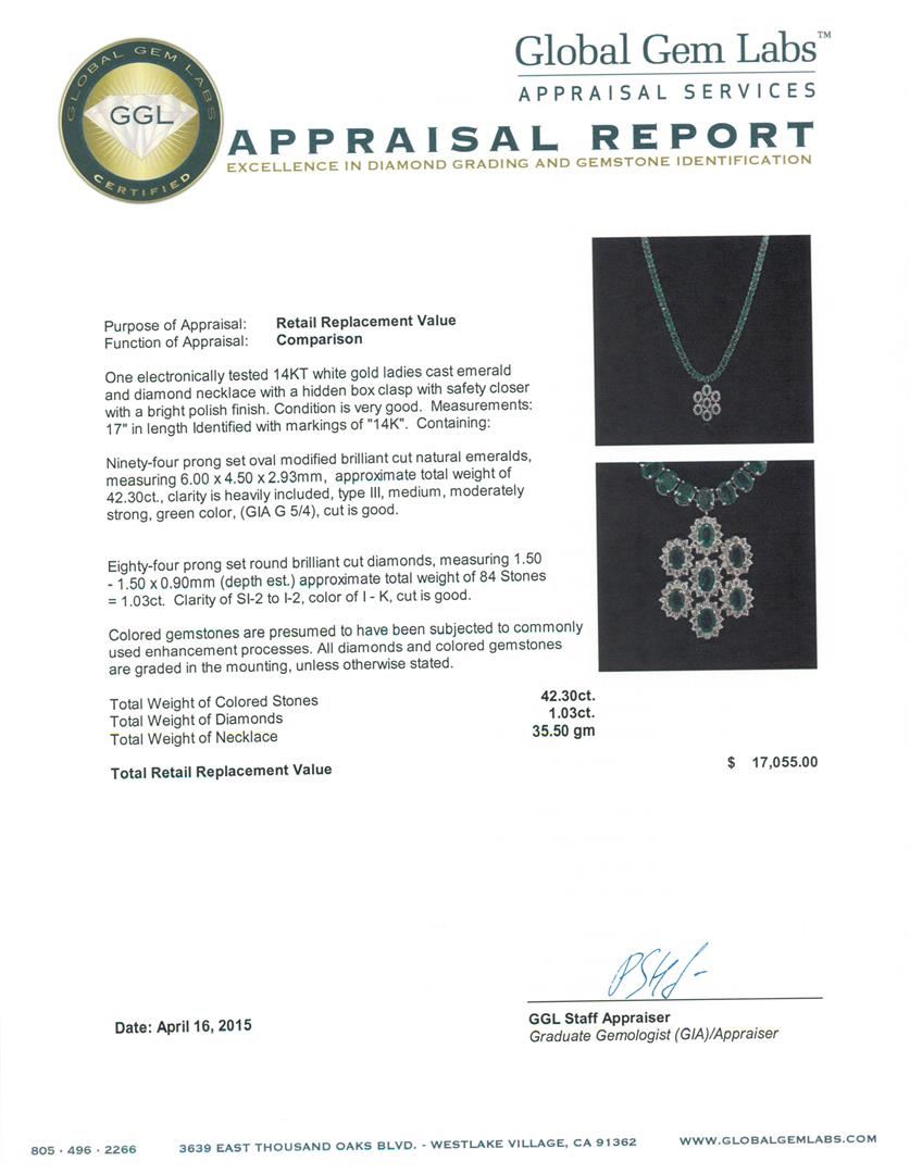 One electronically tested 14KT white gold ladies cast emerald and diamond necklace with a hidden box clasp with safety closer with a bright polish finish. Measurements: 17" in length Identified with markings of "14K". Condition is very good. Containing: Ninety-four prong set oval modified brilliant cut natural emeralds, measuring 6.00 x 4.50 x 2.93mm, approximate total weight of 42.30ct., clarity is heavily included, type III, medium, moderately strong, green color, (GIA G 5/4), cut is good. Eighty-Four prong set round brilliant cut diamonds, measuring 1.50 - 1.50 x 0.90mm (depth est.) approximate total weight of 84 Stones = 1.03ct. Clarity: SI-2 to I-2. Color: I - K, Cut is Good. Colored gemstones are presumed to have been subjected to commonly used enhancement processes. All diamonds and colored gemstones are graded in the mounting, unless otherwise stated. Total Weight of Colored Stones 42.30ct. Total Weight of Diamonds 1.03ct. Total Weight of Necklace 35.50 grams. GGL Appraised at $17,055.00.