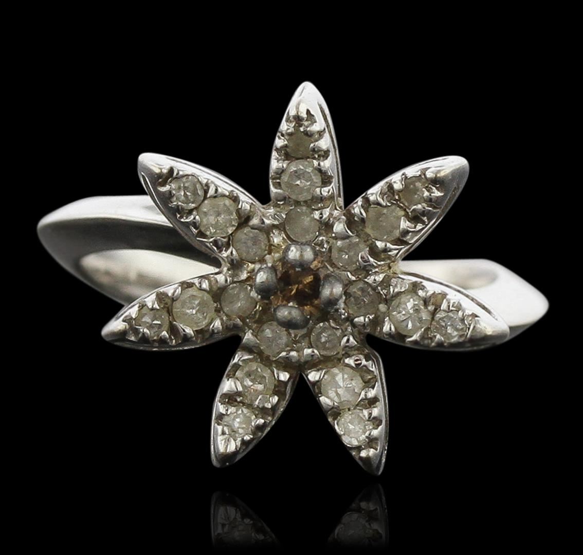 One 14KT white gold diamond starfish ring. Features approximately one pink tourmaline and 21 diamonds weighing a total of about 0.42cts. Total weight of ring is approximately 3.90gms.