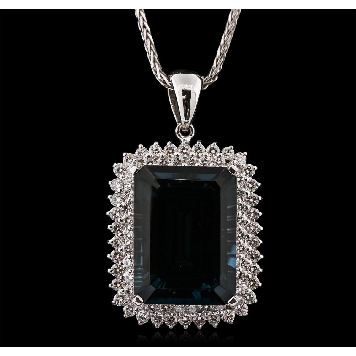 One electronically tested 14KT white gold ladies combination cast & die struck pendant & chain 18.0" long, light fancy cable with a lobster claw clasp with a bright polish finish. Identified with markings of "14K". Condition is new. Containing: One prong set emerald standard step cut natural blue topaz, measuring 24.09 x 17.77 x 10.89mm, approximate weight of 44.43ct., clarity is eye clean, type I, medium, very slightly grayish, blue color, (GIA B 5/3), cut is good. Seventy-Two prong set round brilliant cut diamonds, measuring 2.20 - 2.00 x 1.26mm (depth est.) approximate total weight of 72 Stones = 2.44ct. Clarity: SI-1 to SI-2. Color: H - I, Cut is Very Good. Colored gemstones are presumed to have been subjected to commonly used enhancement processes. All diamonds and colored gemstones are graded in the mounting, unless otherwise stated. Total Weight of Colored Stones 44.43ct. Total Weight of Diamonds 2.44ct. Total Weight of Pendant & Chain 29.20 grams. GGL Appraised at $17,410.00.