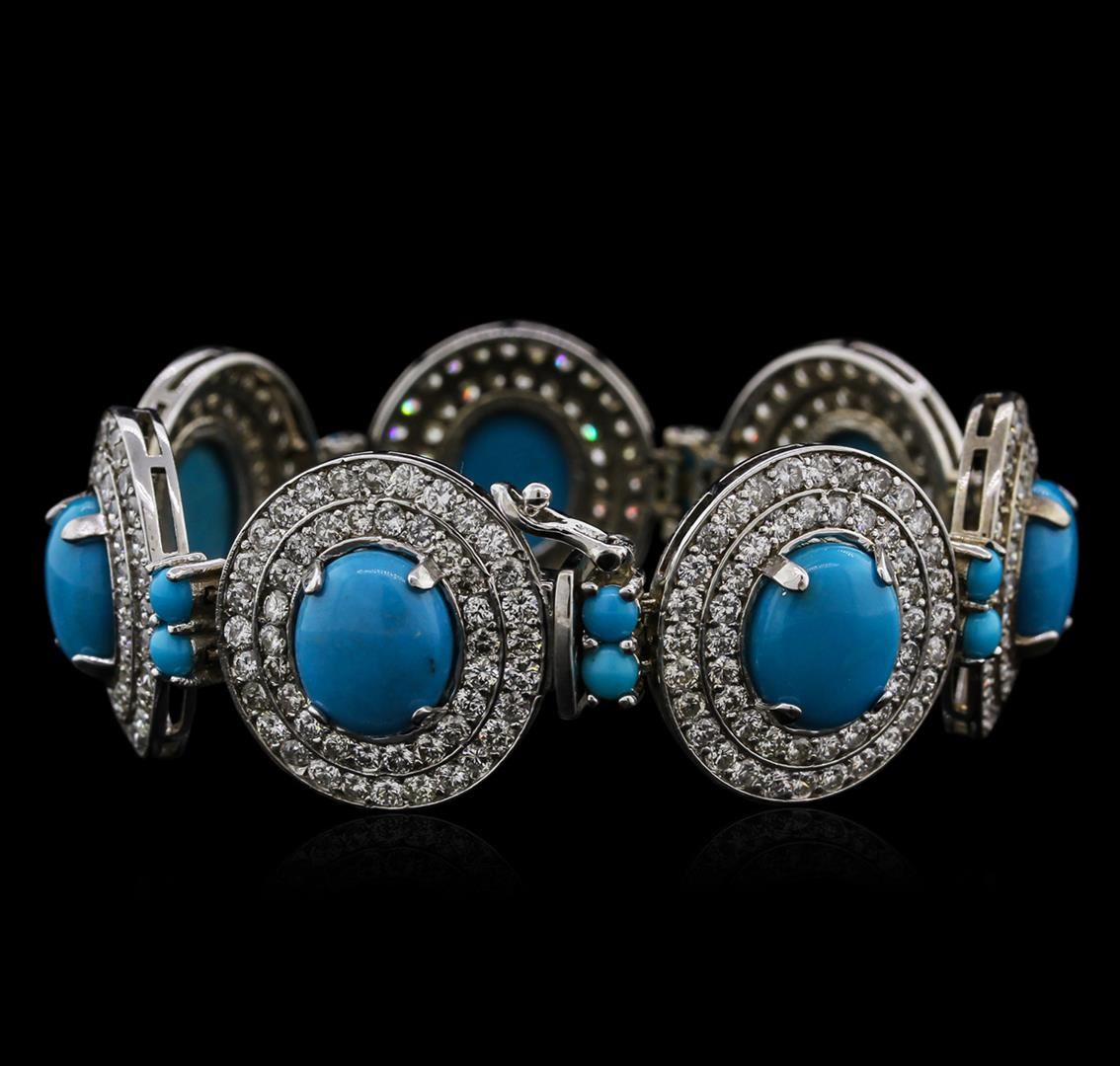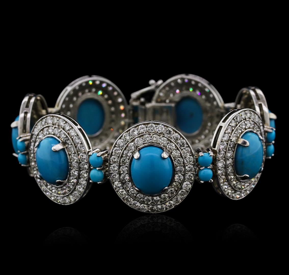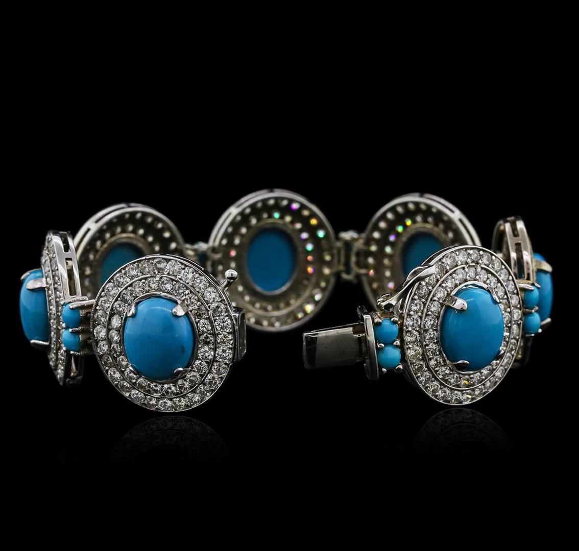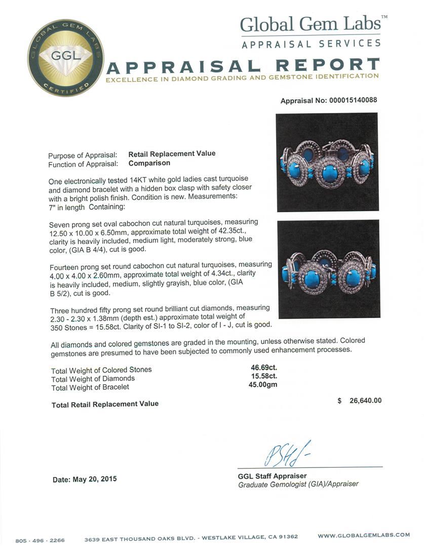 One electronically tested 14KT white gold ladies cast turquoise and diamond bracelet with a hidden box clasp with safety closer with a bright polish finish. Measurements: 7" in length Condition is new. Containing: Seven prong set oval cabochon cut natural turquoises, measuring 12.50 x 10.00 x 6.50mm, approximate total weight of 42.35ct., clarity is heavily included, medium light, moderately strong, blue color, (GIA B 4/4), cut is good. Fourteen prong set round cabochon cut natural turquoises, measuring 4.00 x 4.00 x 2.60mm, approximate total weight of 4.34ct., clarity is heavily included, medium, slightly grayish, blue color, (GIA B 5/2), cut is good. Three Hundred Fifty prong set round brilliant cut diamonds, measuring 2.30 - 2.30 x 1.38mm (depth est.) approximate total weight of 350 Stones = 15.58ct. Clarity: SI-1 to SI-2. Color: I - J, Cut is Good. All diamonds and colored gemstones are graded in the mounting, unless otherwise stated. Colored gemstones are presumed to have been subjected to commonly used enhancement processes. Total Weight of Colored Stones 46.69ct. Total Weight of Diamonds 15.58ct. Total Weight of Bracelet 45.00 grams. GGL Appraised at $26,640.00.