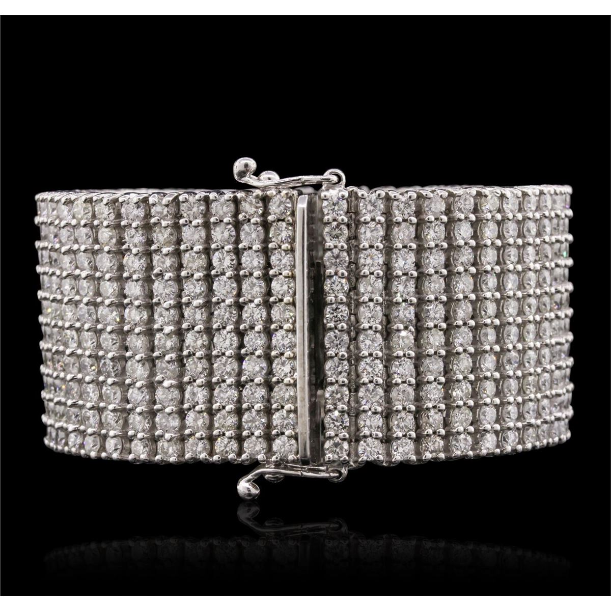 One electronically tested 14KT white gold ladies cast & assembled diamond bracelet with a bright polish finish. Condition is new, good workmanship. The bracelet features a ribbon of diamonds seven inch length and one one-quarter inch width, terminating in a concealed box clasp with twin safeties. Identified with markings of "14K". Containing: Five Hundred prong set round brilliant cut diamonds, measuring 3.00 - 2.90 x 1.77mm (depth est.) approximate. Total Weight of 500 Stones = 47.05ct. Graded in the setting. Clarity: I-1 to I-2. Color: G - J. Total Weight of Diamonds 47.05ct. Total Weight of Bracelet166.80 grams. AIG Appraised at $131,015.00.