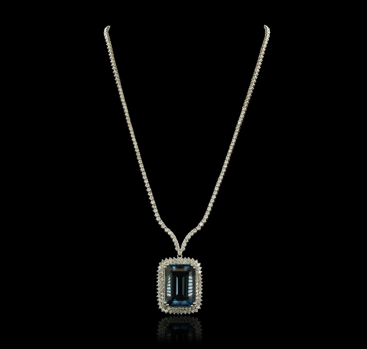 One electronically tested 14KT white gold ladies cast & assembled blue topaz and diamond necklace with a bright polish finish. Condition is new, good workmanship. Eighteen inch length necklace features a blue topaz and two tiered diamond pendant supported by chevron style diamond ribbon, terminating in a concealed clasp with safety. Identified with markings of "14K". Containing: One prong set rectangular step cut natural blue topaz, measuring 25.00 x 17.50 x 11.82mm, exact weight 47.59ct., clarity is eye clean, type I, dark, moderately strong, very slightly greenish blue color, (GIA vslgB 7/4), cut is good. Transmitting light with no distortion, transparent. Refractive index testing results of 1.61to 1.62. This is a conclusive result for topaz. Graded loose. A deposit of a thin layer has been applied to the topaz to produce the intense color effect. The process utilizes a very high temperature treatment, diffusion of ions into the topaz, plus in some cases neutron bombardment has been used to create the color center. Diffusion processes causes the added ions to become part of the crystal surface with no distinct boundary. Do not put a gem treated in this manner into an ultrasonic cleaner. Two Hundred Seventy-Six prong set round brilliant cut diamonds, measuring 2.50 - 1.90 x 1.32mm (depth est.) approximate. Total Weight of 276 Stones = 10.85ct. Graded in the setting. Clarity: SI-1 to I-1. Color: H - J. Total Weight of Colored Stones 47.59ct. Total Weight of Diamonds 10.85ct. Total Weight of Necklace 38.27 grams. AIG Appraised at $36,710.00.
