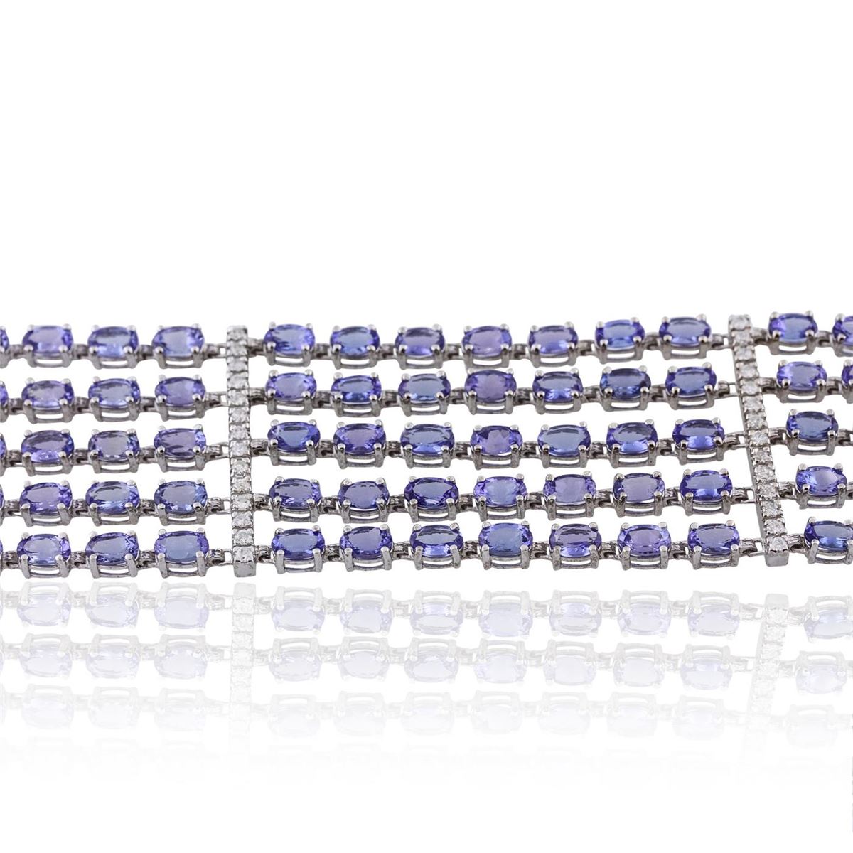 One electronically tested 14KT white gold Ladies combination cast & assembled bracelet with a safety clasp with a bright polish finish. Condition is new. Measurements: 7" in length. Identified with markings of "14K". Containing: One hundred five prong set oval modified brilliant cut natural tanzanites, measuring 5.99 x 4.00 x 2.78mm, approximate. Total Weight of 48.30ct., clarity is eye clean, type I, medium light, very slightly grayish, violet color, (GIA V 4/3), cut is good. Forty-One prong set round brilliant cut diamonds, measuring 1.90 - 1.90 x 1.14mm (depth est.) approximate. Total Weight of 41 Stones = 1.03ct. Clarity: I-1 to I-2. Color: H - J, Cut is Good. Colored gemstones are presumed to have been subjected to commonly used enhancement processes. All diamonds and colored gemstones are graded in the mounting, unless otherwise stated. Total Weight of Colored Stones 48.30ct. Total Weight of Diamonds 1.03ct. Total Weight of Bracelet 49.60 grams. GGL Appraised at $37,005.00.