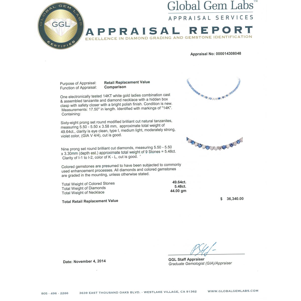 One electronically tested 14KT white gold ladies combination cast & assembled tanzanite and diamond necklace with a hidden box clasp with safety closer with a bright polish finish. Measurements: 17.50" in length. Identified with markings of "14K". Condition is new. Containing: Sixty-eight prong set round modified brilliant cut natural tanzanites, measuring 5.50 - 5.50 x 3.58 mm, approximate total weight of 49.64ct., clarity is eye clean, type I, medium light, moderately strong, violet color, (GIA V 4/4), cut is good. Nine prong set round brilliant cut diamonds, measuring 5.50 - 5.50 x 3.30mm (depth est.) approximate total weight of 9 Stones = 5.48ct. Clarity: I-1 to I-2. Color: K - L, Cut is Good. 'Colored gemstones are presumed to have been subjected to commonly used enhancement processes. All diamonds and colored gemstones are graded in the mounting, unless otherwise stated. Total Weight of Colored Stones 49.64ct. Total Weight of Diamonds 5.48ct. Total Weight of Necklace 44.00 grams. GGL Appraised at $36,340.00.