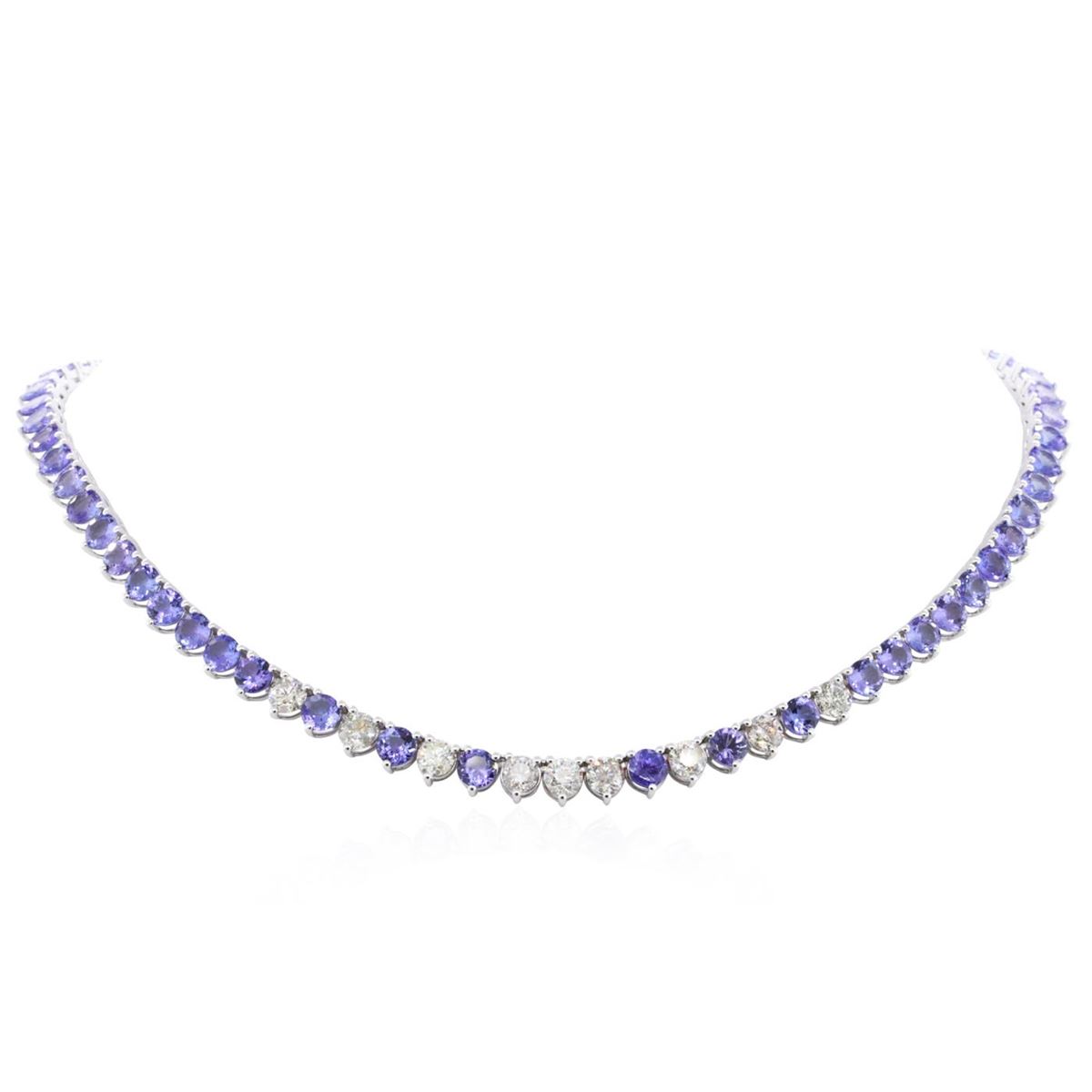 One electronically tested 14KT white gold ladies combination cast & assembled tanzanite and diamond necklace with a hidden box clasp with safety closer with a bright polish finish. Measurements: 17.50" in length. Identified with markings of "14K". Condition is new. Containing: Sixty-eight prong set round modified brilliant cut natural tanzanites, measuring 5.50 - 5.50 x 3.58 mm, approximate total weight of 49.64ct., clarity is eye clean, type I, medium light, moderately strong, violet color, (GIA V 4/4), cut is good. Nine prong set round brilliant cut diamonds, measuring 5.50 - 5.50 x 3.30mm (depth est.) approximate total weight of 9 Stones = 5.48ct. Clarity: I-1 to I-2. Color: K - L, Cut is Good. 'Colored gemstones are presumed to have been subjected to commonly used enhancement processes. All diamonds and colored gemstones are graded in the mounting, unless otherwise stated. Total Weight of Colored Stones 49.64ct. Total Weight of Diamonds 5.48ct. Total Weight of Necklace 44.00 grams. GGL Appraised at $36,340.00.