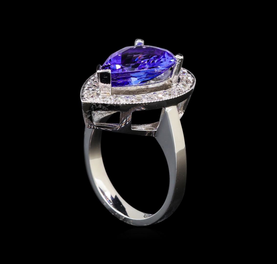 One electronically tested 14KT white gold ladies cast tanzanite and diamond ring with a bright polish finish. Identified with markings of "K14". Condition is new. Containing: One prong set pear modified brilliant cut natural tanzanite, measuring 14.39 x 9.98 x 5.20mm, approximate weight of 5.00ct., clarity is eye clean, type I, medium light, very slightly grayish, violet color, (GIA V 4/3), cut is good. Twenty-Seven prong set round brilliant cut diamonds, measuring 1.50 - 1.50 x 0.90mm (depth est.) approximate. total weight of 27 Stones = 0.33ct. Clarity: SI-1 to SI-2. Color: H - I, Cut is Good. Colored gemstones are presumed to have been subjected to commonly used enhancement processes. All diamonds and colored gemstones are graded in the mounting, unless otherwise stated. Total Weight of Colored Stones 5.00ct. Total Weight of Diamonds 0.33ct. Total Weight of Ring 8.60 grams. GGL Appraised at $4,830.00.