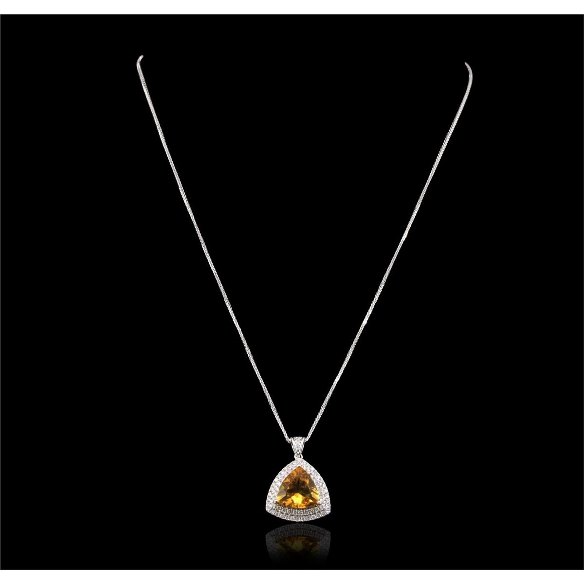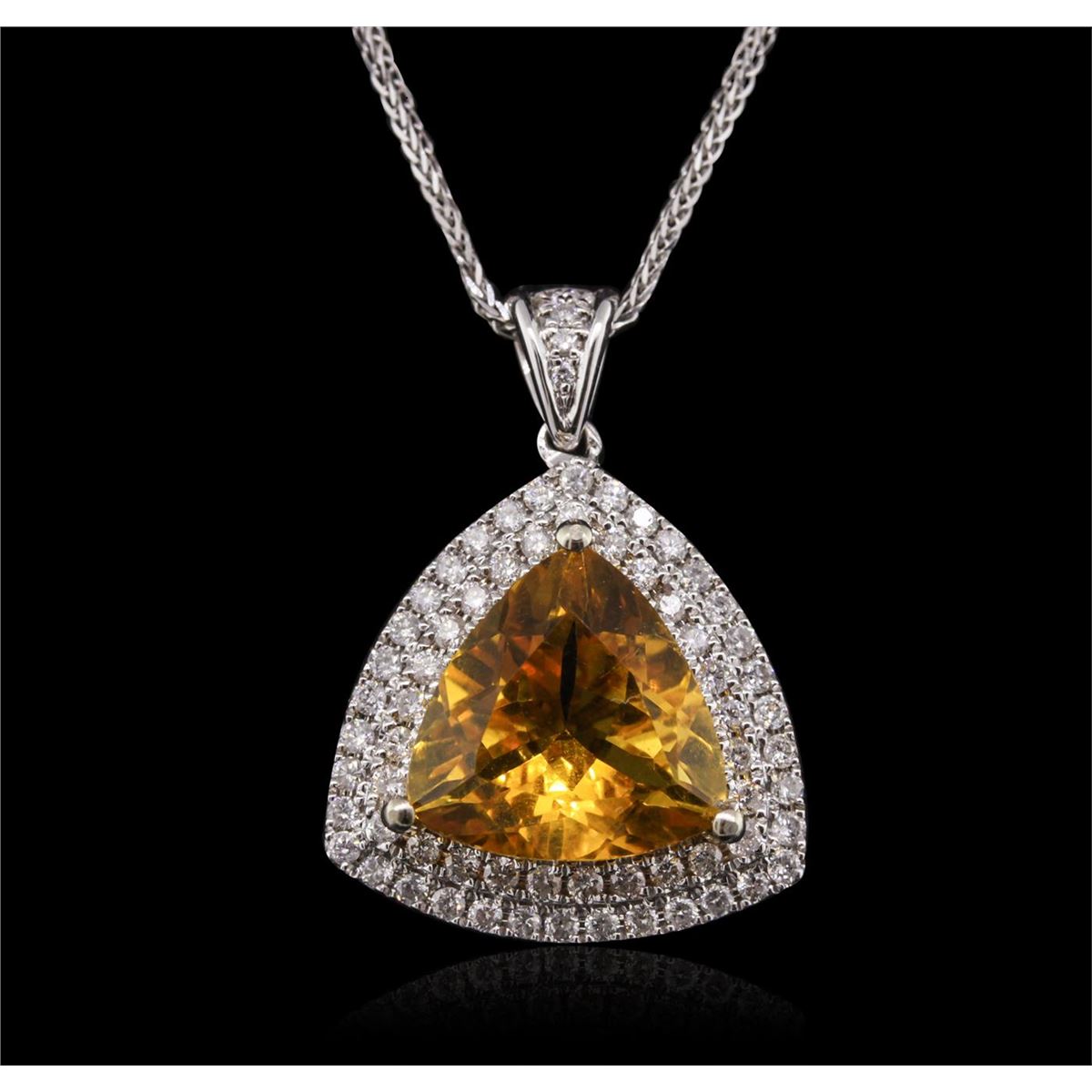 One electronically tested 14KT white gold ladies cast & assembled citrine and diamond pendant with chain. Condition is new, good workmanship. The pendant features a citrine set within a two tiered diamond bezels, completed by a diamond set bail. The pendant is supported by an eighteen inch length 14KT white gold designer style chain, terminating in a lobster claw clasp. Bright polish finish. Identified with markings of "14K". Containing: One prong set triangle mixed cut natural citrine quartz, measuring 11.90 x 11.70 x 6.70mm, 10%. bulge factor, approximate weight of 5.01ct., clarity is eye clean, type I, medium dark, slightly brownish, orangy yellow color, (GIA oY 6/2), cut is good. Transmitting light with no distortion, transparent. Colored Stone Grading Report attached. Graded in the setting. Sixty-Three prong set round brilliant cut diamonds, measuring 1.40 - 1.30 x 0.81mm (depth est.) approximate. Total Weight of 63 Stones = 0.66ct. Graded in the setting. Clarity: SI-1 to I-1. Color: G - I Five bead set round brilliant cut diamonds, measuring 1.10 - 1.00 x 0.63mm (depth est.) approximate. Total Weight of 5 Stones = 0.06ct. Graded in the setting. Clarity: SI-1 to SI-2. Color: G - I. Total Weight of Colored Stones 5.01ct. Total Weight of Diamonds 0.72ct. Total Weight of Pendant With Chain 5.64 grams. AIG Appraised at $3,505.00.
