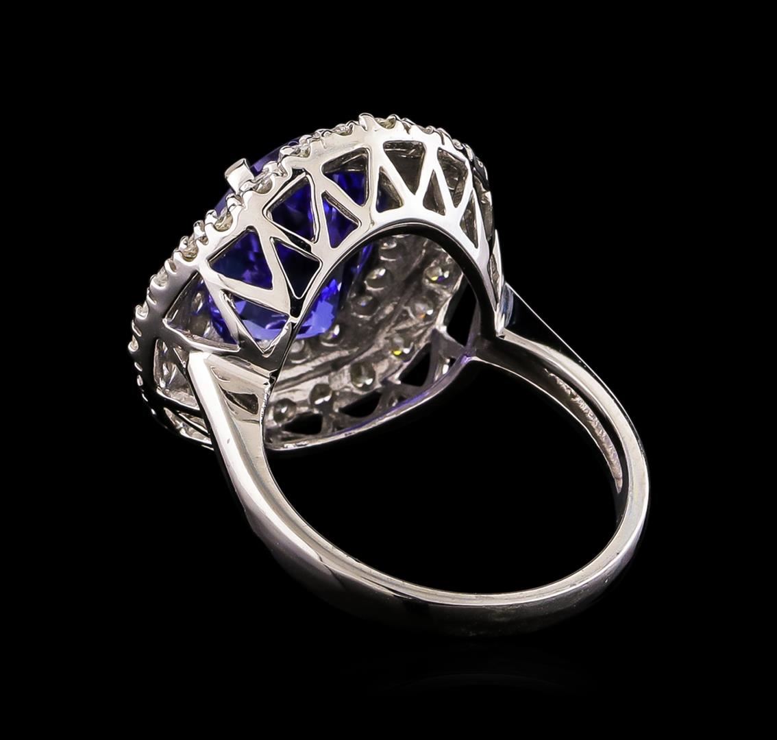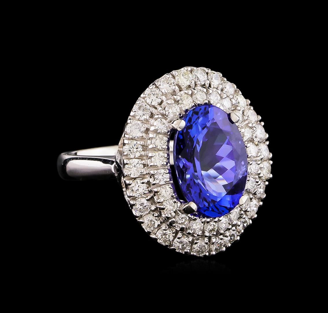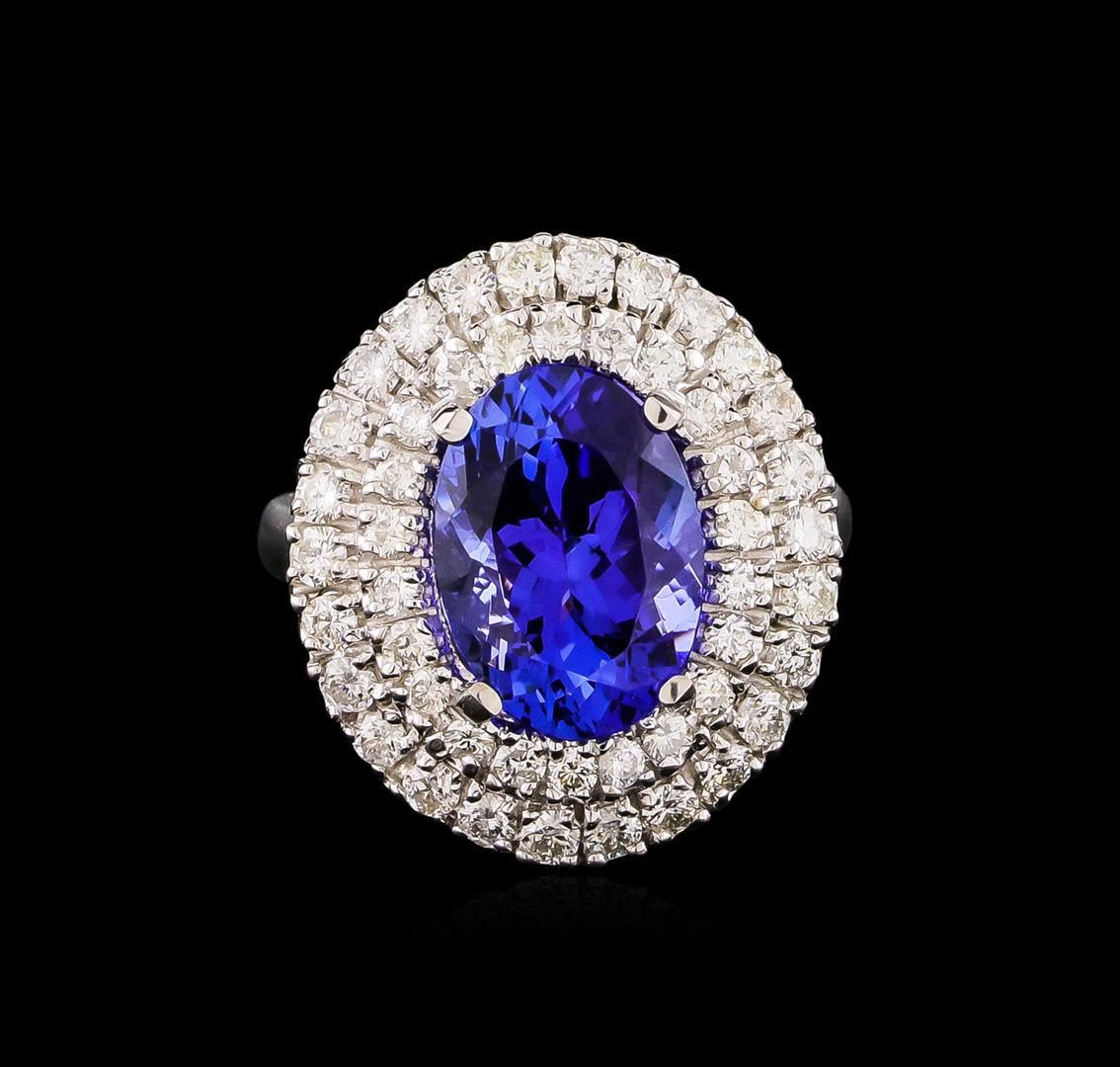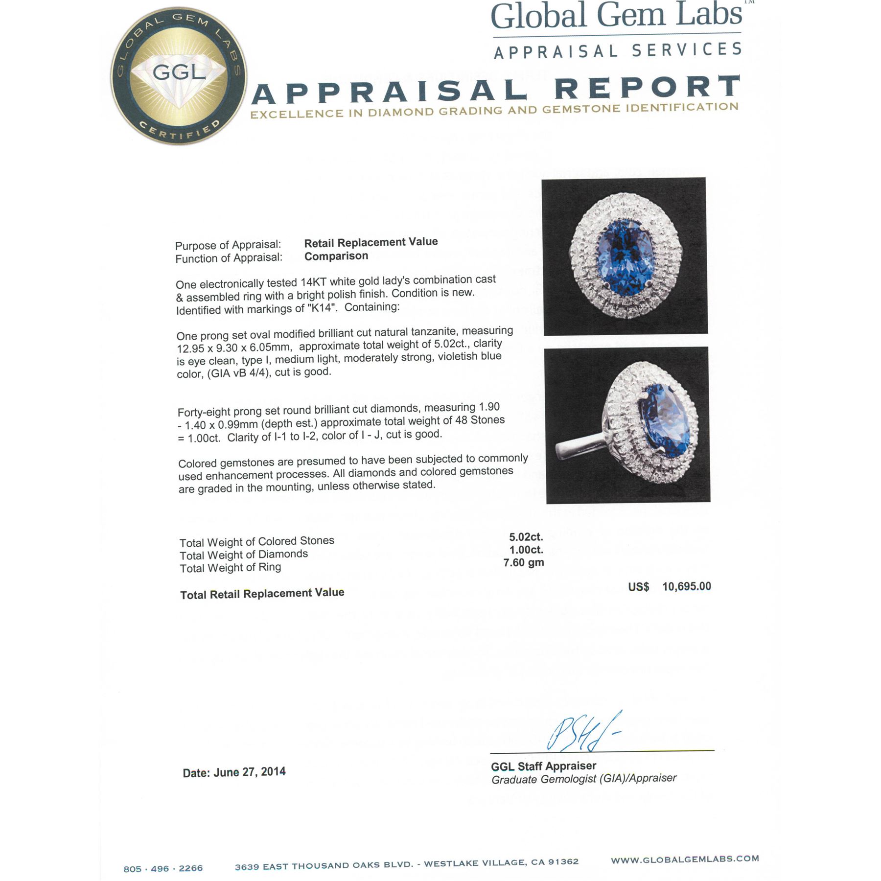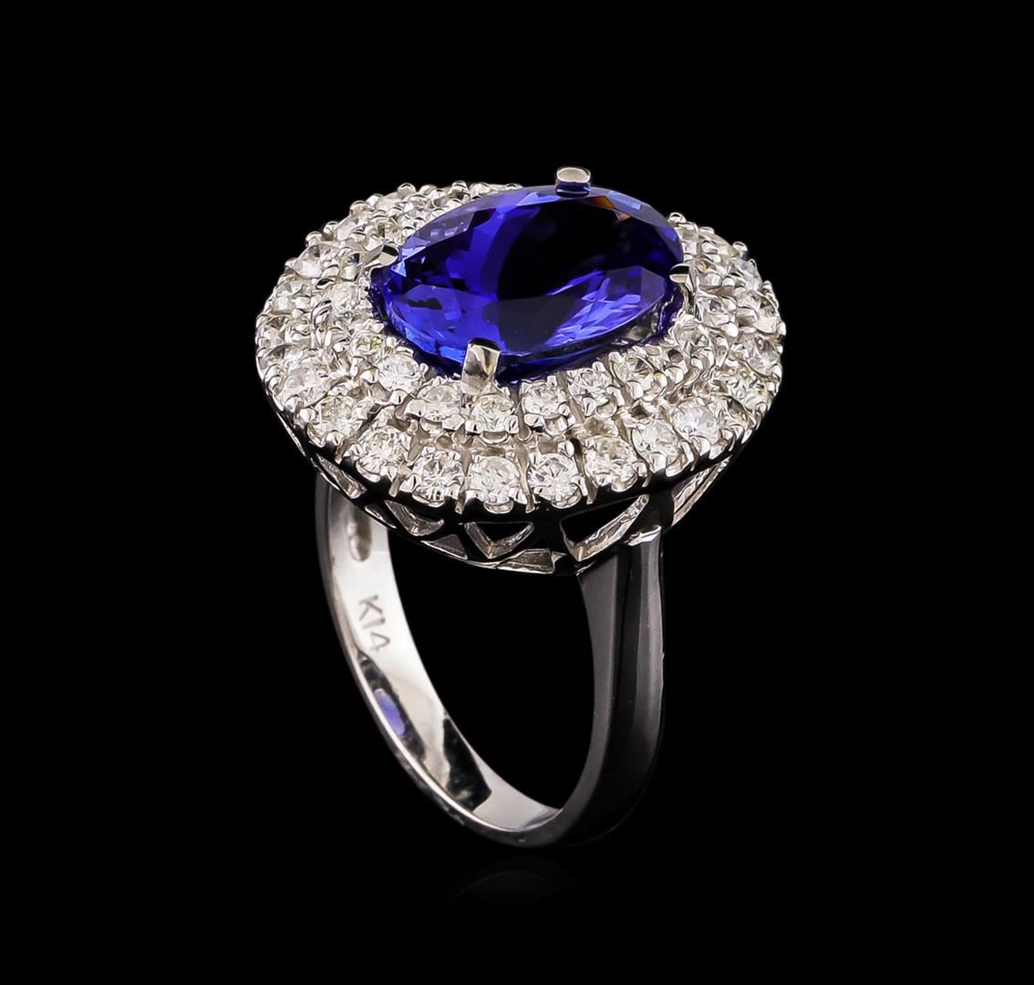 One electronically tested 14KT white gold Ladies combination cast & assembled ring with a bright polish finish. Condition is new. Identified with markings of "K14". Containing: One prong set oval modified brilliant cut natural tanzanite, measuring 12.95 x 9.30 x 6.05mm, approximate total weight of 5.02ct., clarity is eye clean, type I, medium light, moderately strong, violetish blue color, (GIA vB 4/4), cut is good. Forty-Eight prong set round brilliant cut diamonds, measuring 1.90 - 1.40 x 0.99mm (depth est.) approximate total weight of 48 Stones = 1.00ct. Clarity: I-1 to I-2. Color: I - J, Cut is Good. Colored gemstones are presumed to have been subjected to commonly used enhancement processes. All diamonds and colored gemstones are graded in the mounting, unless otherwise stated. Total Weight of Colored Stones 5.02ct. Total Weight of Diamonds 1.00ct. Total Weight of Ring 7.60 grams. GGL Appraised at $10,695.00.