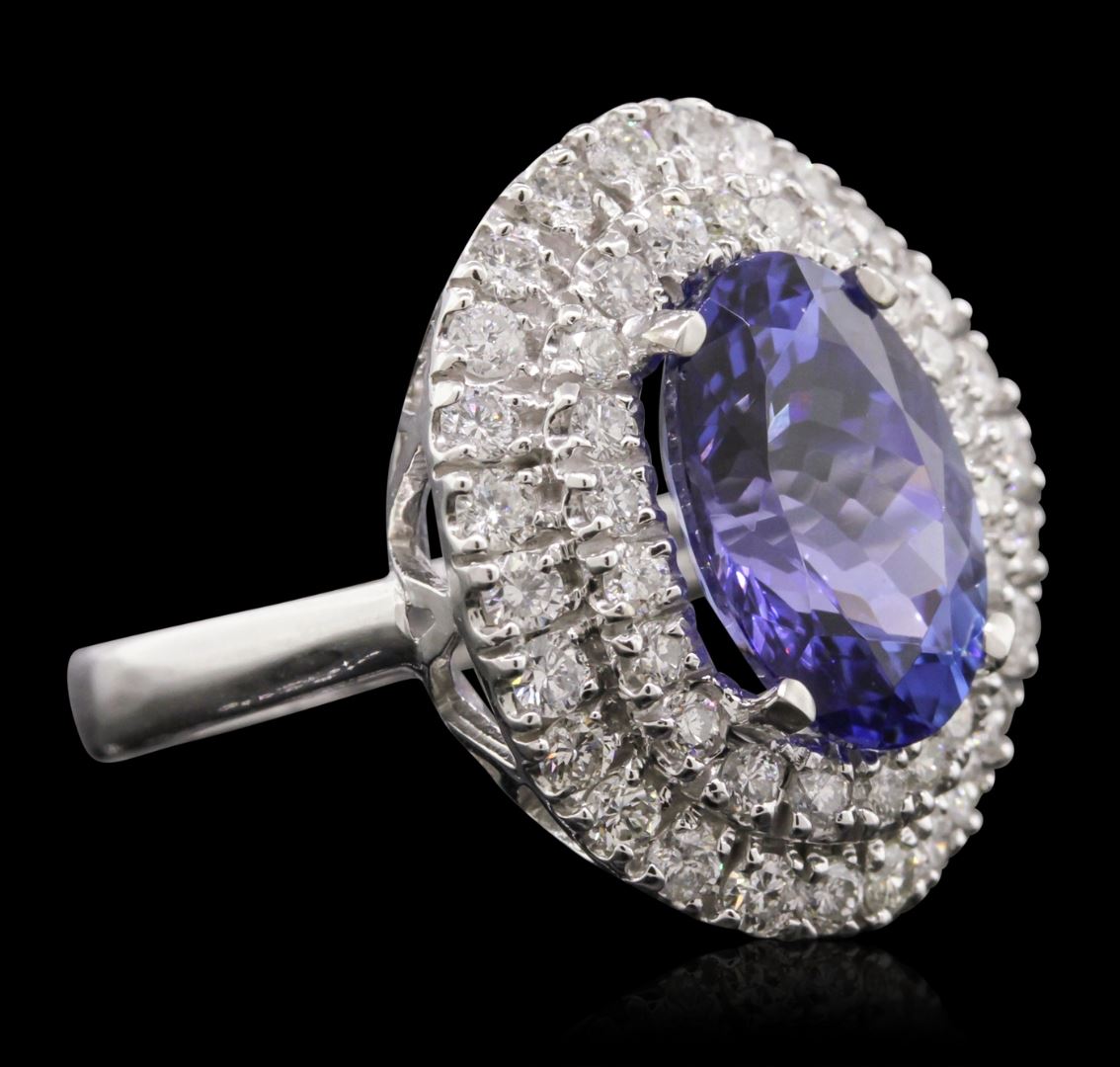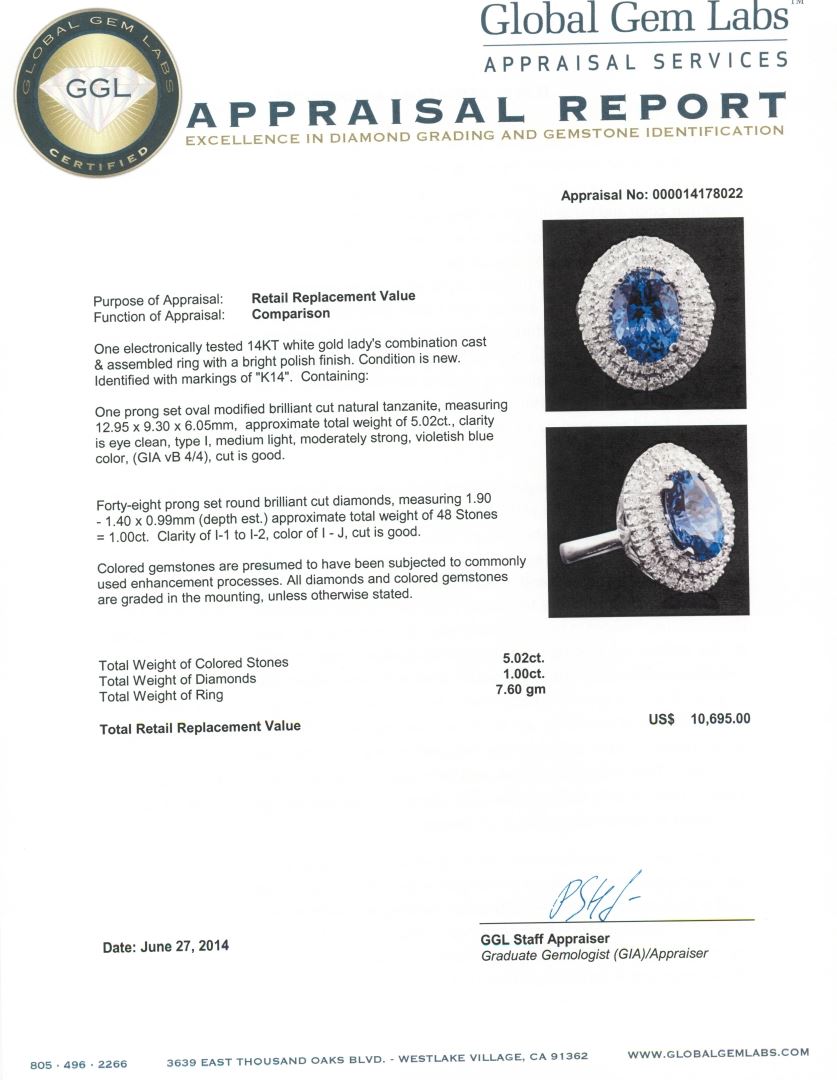 One electronically tested 14KT white gold Ladies combination cast & assembled ring with a bright polish finish. Condition is new. Identified with markings of "K14". Containing: One prong set oval modified brilliant cut natural tanzanite, measuring 12.95 x 9.30 x 6.05mm, approximate total weight of 5.02ct., clarity is eye clean, type I, medium light, moderately strong, violetish blue color, (GIA vB 4/4), cut is good. Forty-Eight prong set round brilliant cut diamonds, measuring 1.90 - 1.40 x 0.99mm (depth est.) approximate total weight of 48 Stones = 1.00ct. Clarity: I-1 to I-2. Color: I - J, Cut is Good. Colored gemstones are presumed to have been subjected to commonly used enhancement processes. All diamonds and colored gemstones are graded in the mounting, unless otherwise stated. Total Weight of Colored Stones 5.02ct. Total Weight of Diamonds 1.00ct. Total Weight of Ring 7.60 grams. GGL Appraised at $10,695.00.