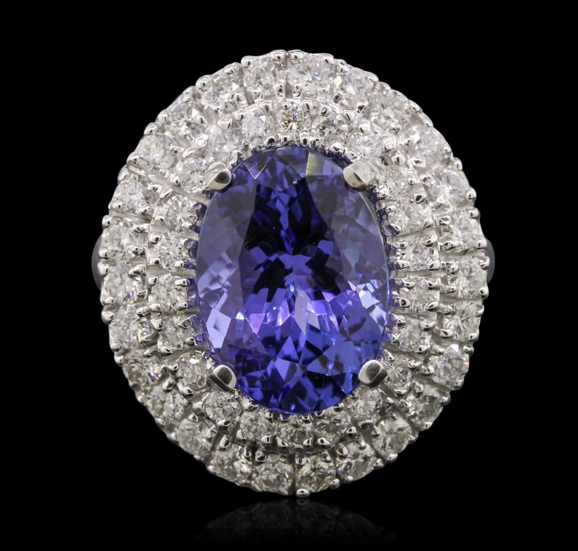 One electronically tested 14KT white gold Ladies combination cast & assembled ring with a bright polish finish. Condition is new. Identified with markings of "K14". Containing: One prong set oval modified brilliant cut natural tanzanite, measuring 12.95 x 9.30 x 6.05mm, approximate total weight of 5.02ct., clarity is eye clean, type I, medium light, moderately strong, violetish blue color, (GIA vB 4/4), cut is good. Forty-Eight prong set round brilliant cut diamonds, measuring 1.90 - 1.40 x 0.99mm (depth est.) approximate total weight of 48 Stones = 1.00ct. Clarity: I-1 to I-2. Color: I - J, Cut is Good. Colored gemstones are presumed to have been subjected to commonly used enhancement processes. All diamonds and colored gemstones are graded in the mounting, unless otherwise stated. Total Weight of Colored Stones 5.02ct. Total Weight of Diamonds 1.00ct. Total Weight of Ring 7.60 grams. GGL Appraised at $10,695.00.
