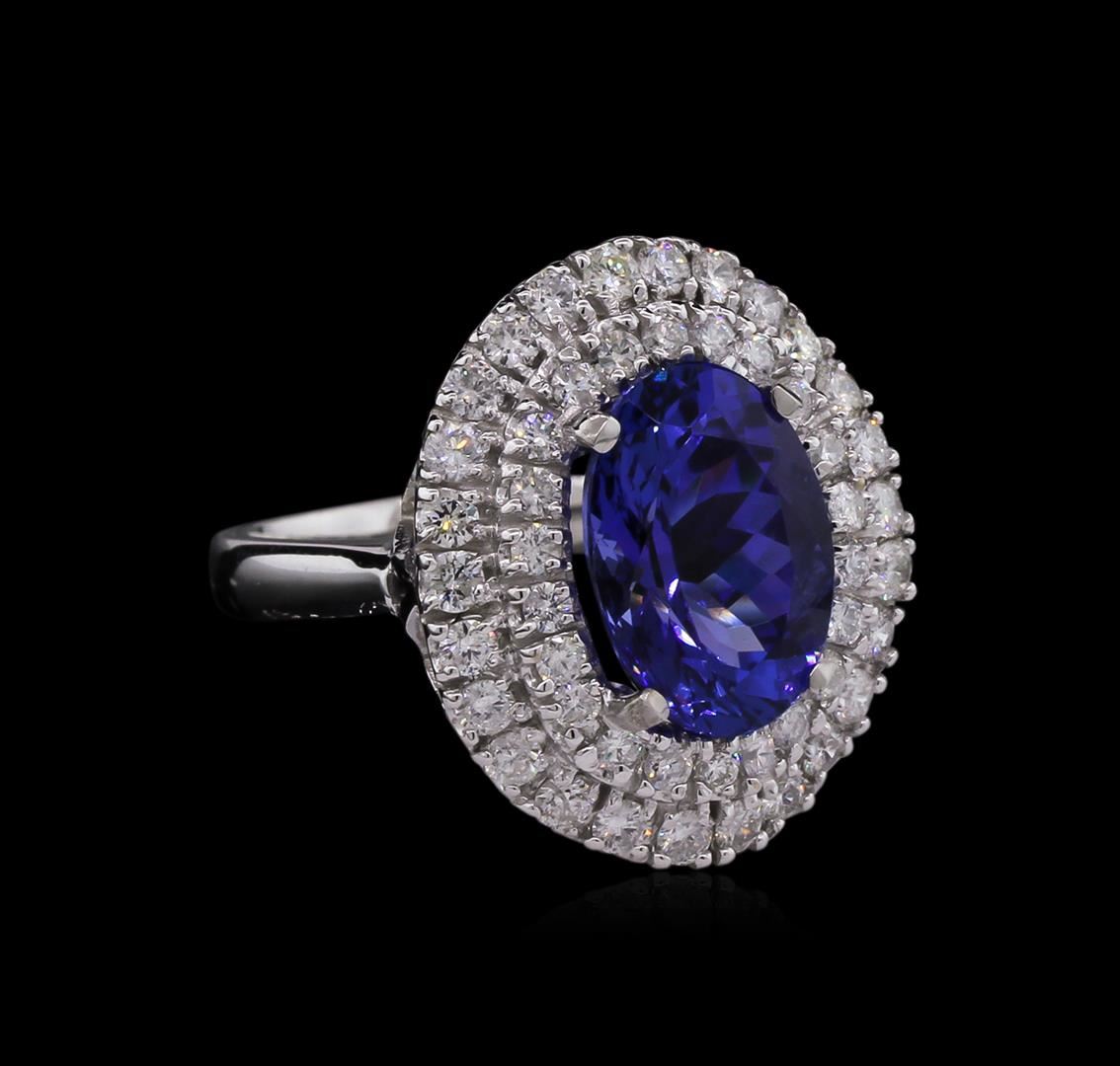 One electronically tested 14KT white gold Ladies combination cast & assembled ring with a bright polish finish. Condition is new. Identified with markings of "K14". Containing: One prong set oval modified brilliant cut natural tanzanite, measuring 12.95 x 9.30 x 6.05mm, approximate total weight of 5.02ct., clarity is eye clean, type I, medium light, moderately strong, violetish blue color, (GIA vB 4/4), cut is good. Forty-Eight prong set round brilliant cut diamonds, measuring 1.90 - 1.40 x 0.99mm (depth est.) approximate total weight of 48 Stones = 1.00ct. Clarity: I-1 to I-2. Color: I - J, Cut is Good. Colored gemstones are presumed to have been subjected to commonly used enhancement processes. All diamonds and colored gemstones are graded in the mounting, unless otherwise stated. Total Weight of Colored Stones 5.02ct. Total Weight of Diamonds 1.00ct. Total Weight of Ring 7.60 grams. GGL Appraised at $10,695.00.