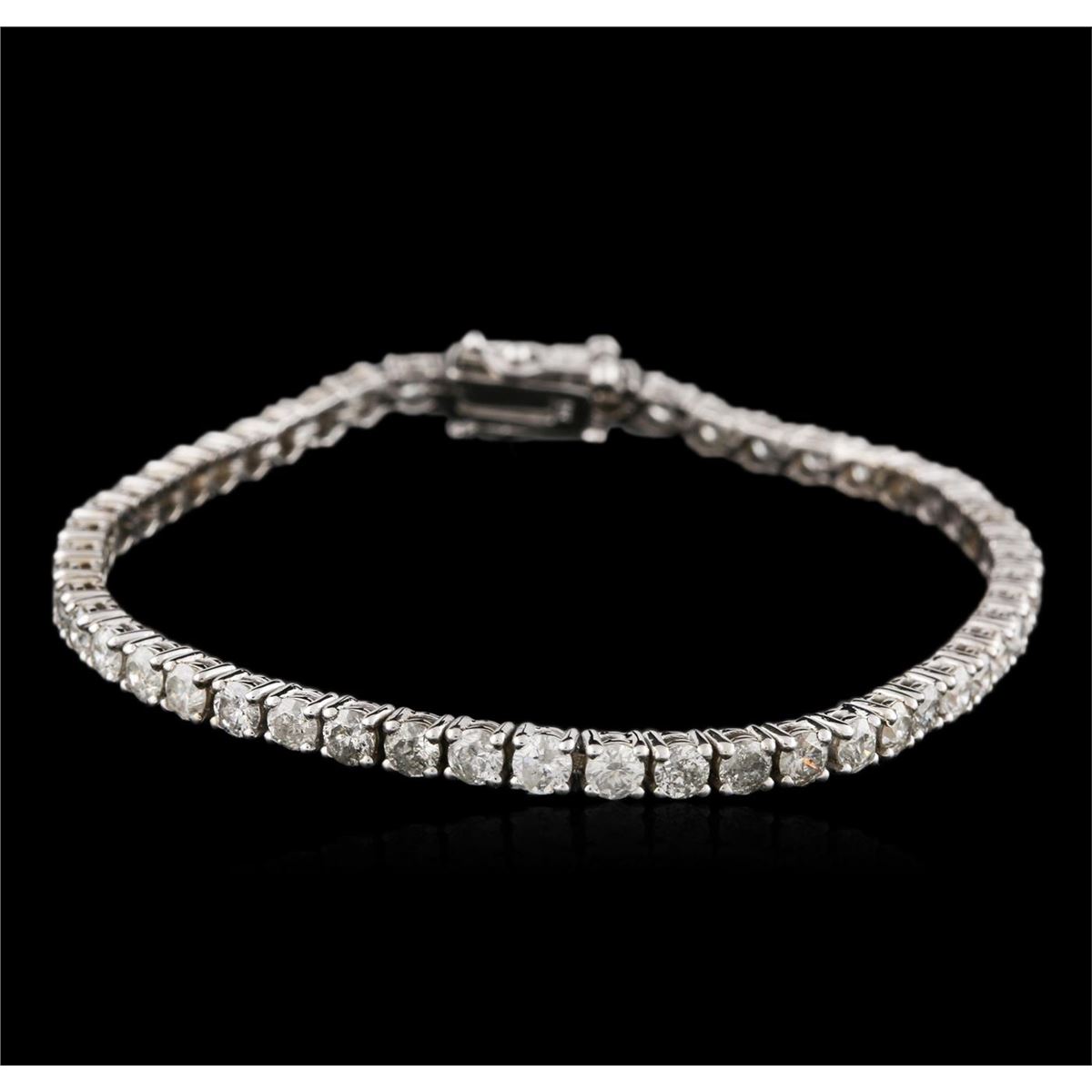 One electronically tested 14KT white gold ladies cast diamond tennis bracelet with a hidden box clasp with a bright and brushed finish. Measurements: 7.0" in length. Identified with markings of "14K". Condition is new. Containing: Fifty-One prong set round brilliant cut diamonds, measuring 3.00 - 3.00 x 1.80mm (depth est.) approximate total weight of 51 Stones = 5.04ct. Clarity: I-2 to I-3. Color: I - J. All diamonds are graded in the mounting, unless otherwise stated. Total Weight of Diamonds 5.04ct. Total Weight of Tennis Bracelet 9.90 grams. GGL Appraised at $8,830.00.