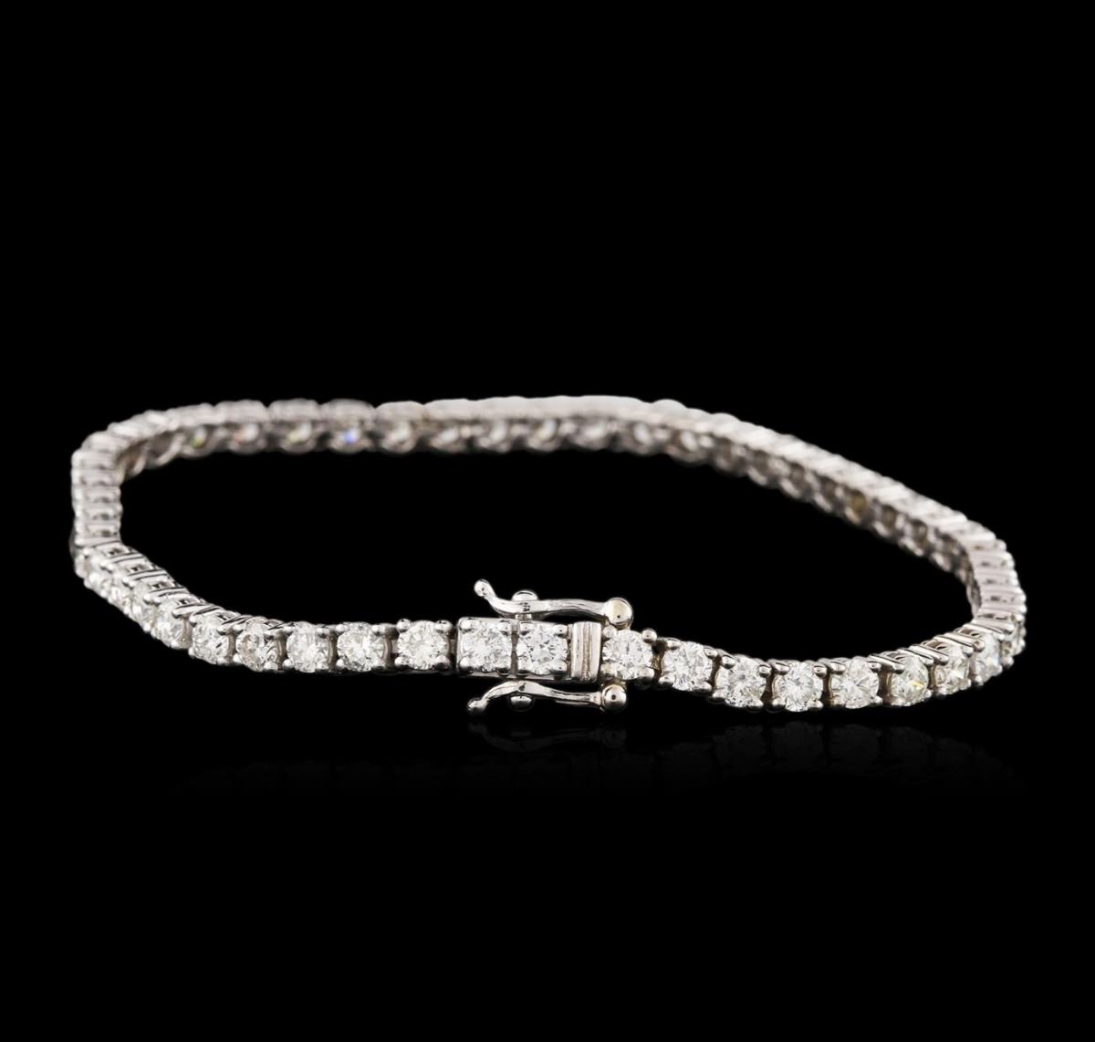 One electronically tested 14KT white gold ladies cast diamond tennis bracelet with a hidden box clasp with a bright and brushed finish. Measurements: 7." in length. Identified with markings of "14K". Condition is new. Containing: Fifty-One prong set round brilliant cut diamonds, measuring 3.00 - 3.00 x 1.80mm (depth est.) approximate total weight of 51 Stones = 5.04ct. Clarity: SI-2 to I-2. Color: I - K. All diamonds are graded in the mounting, unless otherwise stated. Total Weight of Diamonds 5.04ct. Total Weight of Tennis Bracelet 10.00 grams. GGL Appraised at $10,730.00.