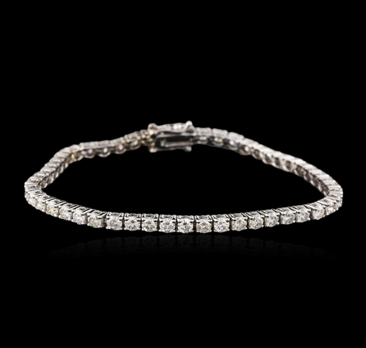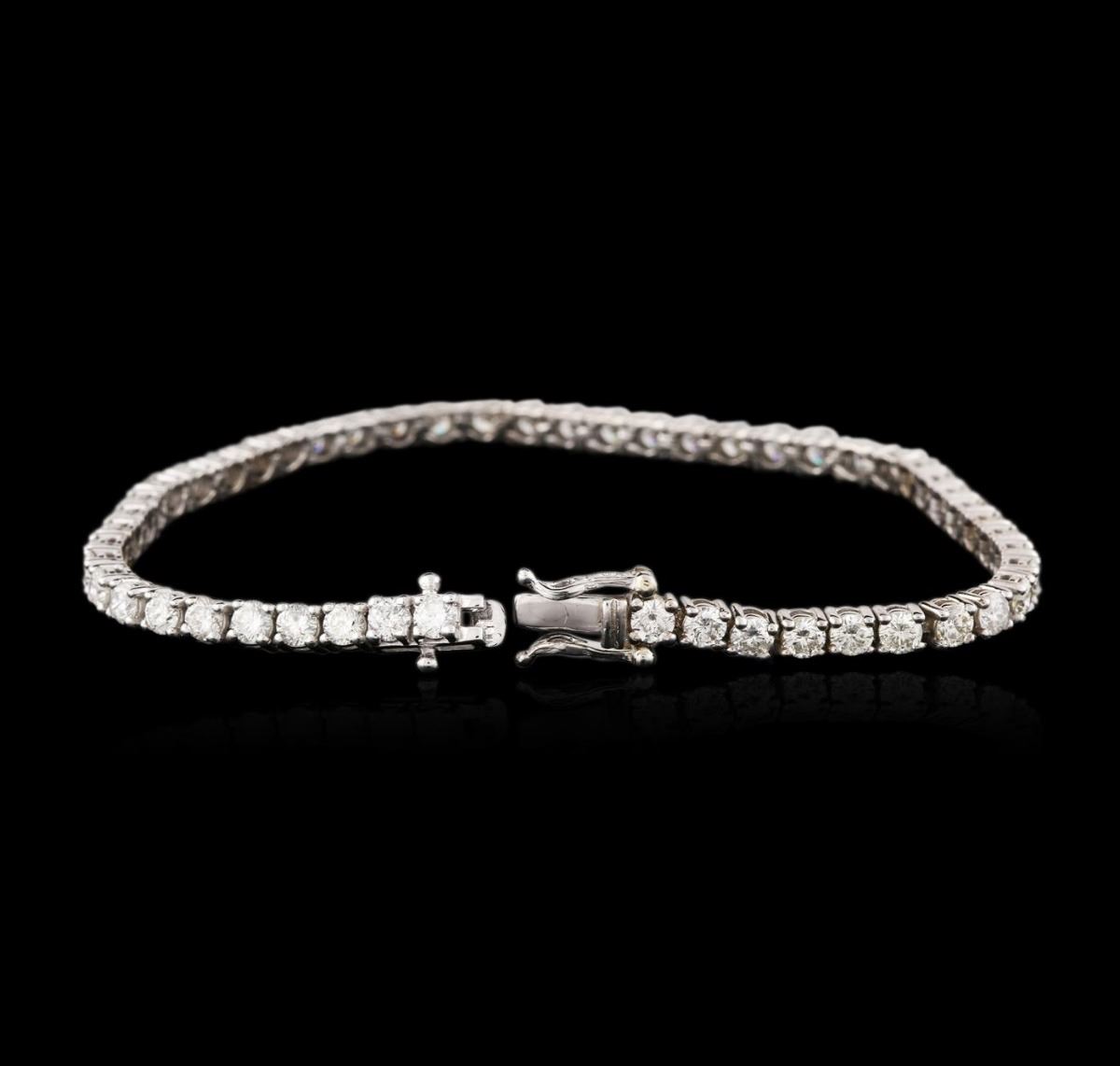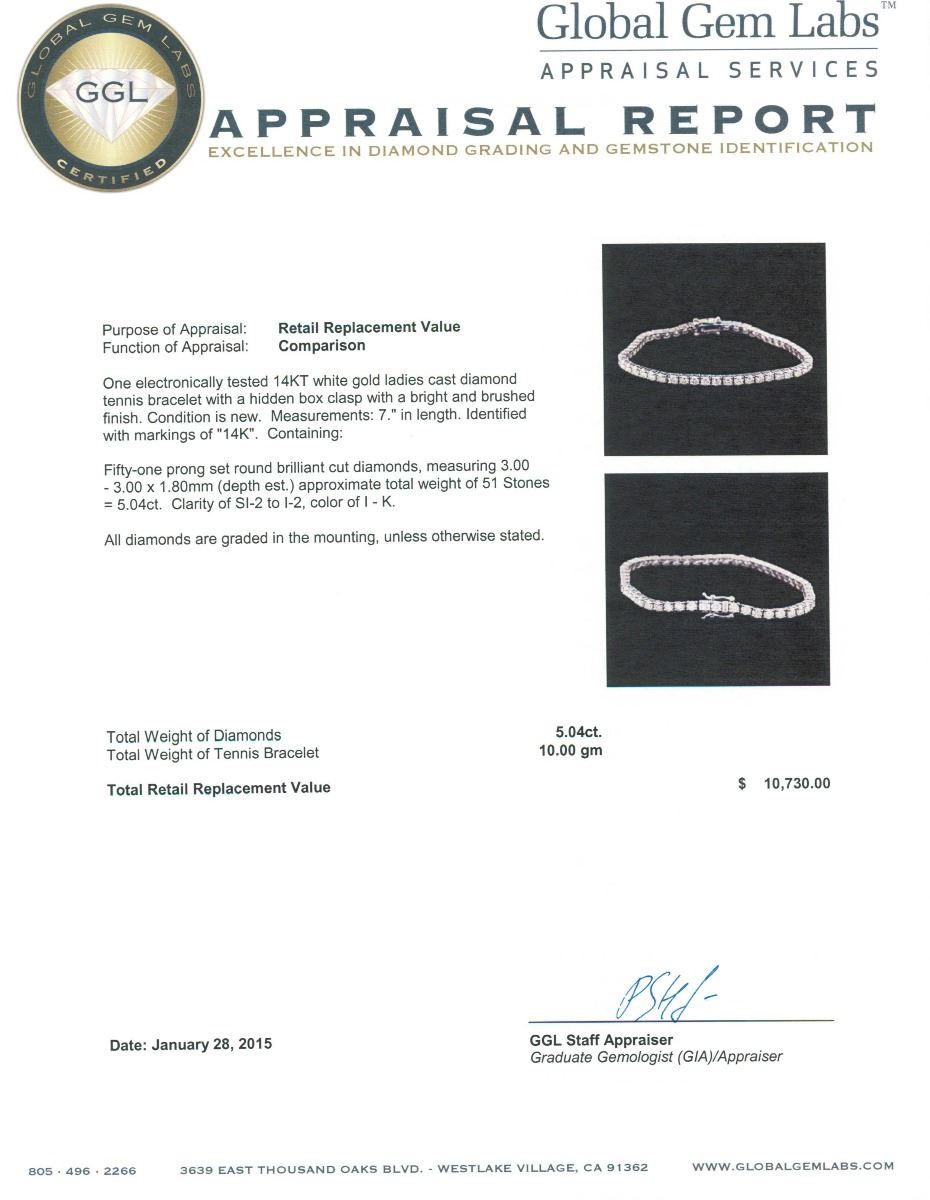 One electronically tested 14KT white gold ladies cast diamond tennis bracelet with a hidden box clasp with a bright and brushed finish. Measurements: 7." in length. Identified with markings of "14K". Condition is new. Containing: Fifty-One prong set round brilliant cut diamonds, measuring 3.00 - 3.00 x 1.80mm (depth est.) approximate total weight of 51 Stones = 5.04ct. Clarity: SI-2 to I-2. Color: I - K. All diamonds are graded in the mounting, unless otherwise stated. Total Weight of Diamonds 5.04ct. Total Weight of Tennis Bracelet 10.00 grams. GGL Appraised at $10,730.00.
