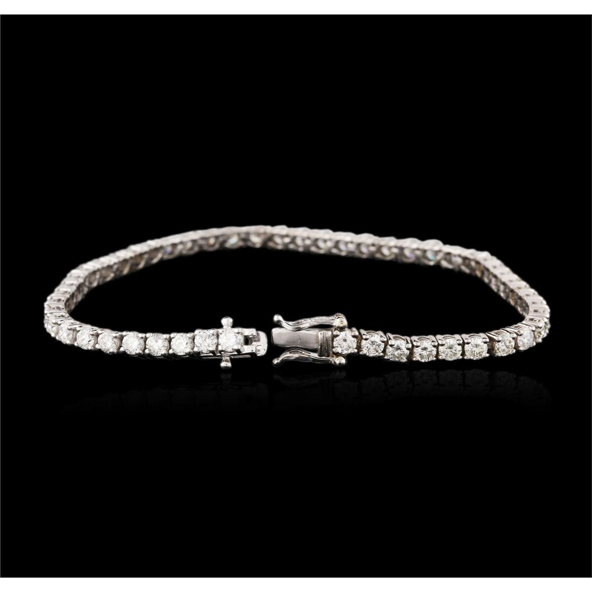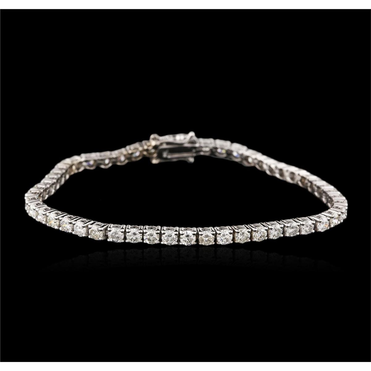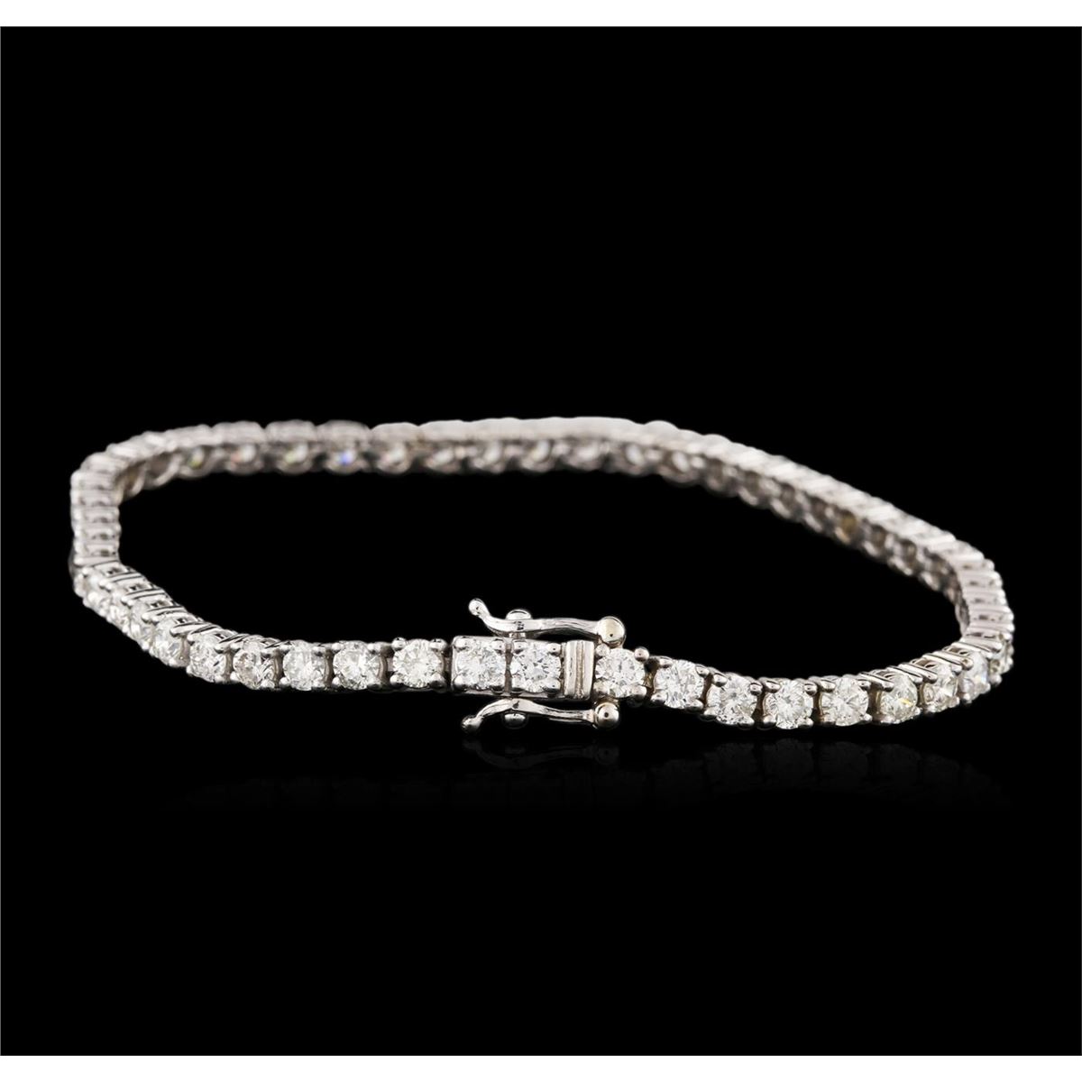 One electronically tested 14KT white gold ladies cast diamond tennis bracelet with a hidden box clasp with a bright and brushed finish. Measurements: 7." in length. Identified with markings of "14K". Condition is new. Containing: Fifty-One prong set round brilliant cut diamonds, measuring 3.00 - 3.00 x 1.80mm (depth est.) approximate total weight of 51 Stones = 5.04ct. Clarity: SI-2 to I-2. Color: I - K. All diamonds are graded in the mounting, unless otherwise stated. Total Weight of Diamonds 5.04ct. Total Weight of Tennis Bracelet 10.00 grams. GGL Appraised at $10,730.00.