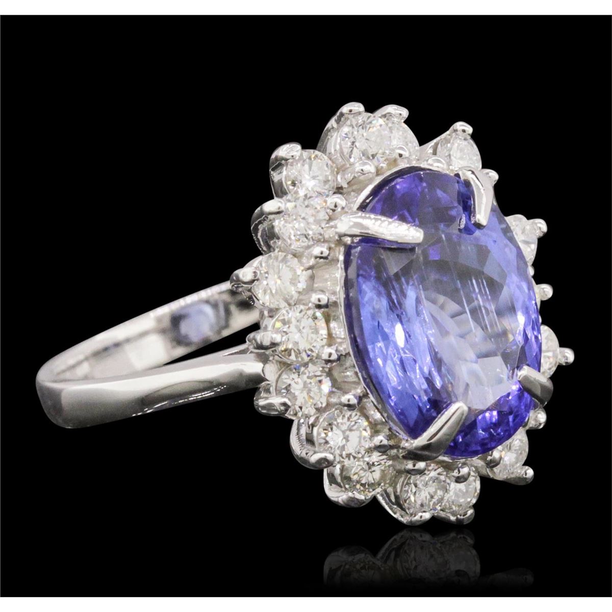 One electronically tested 14KT white gold ladies combination cast & assembled ring with a bright polish finish. Condition is new. Identified with markings of "K14". Containing: One prong set oval modified brilliant cut natural tanzanite, measuring 12.30 x 9.50 x 6.35mm, approximate weight of 5.05ct., clarity is eye clean, type I, medium light, moderately strong, bluish violet color, (GIA bV 4/4), cut is good. Eighteen prong set round brilliant cut diamonds, measuring 2.40 - 2.40 x 1.44mm (depth est.) approximate total weight of 18 Stones = 0.91ct. Clarity: SI-1 to SI-2. Color: J - K, Cut is Good. Colored gemstones are presumed to have been subjected to commonly used enhancement processes. All diamonds and colored gemstones are graded in the mounting, unless otherwise stated. Total Weight of Colored Stones 5.05ct. Total Weight of Diamonds 0.91ct. Total Weight of Ring 6.00 grams. GGL Appraised at $10,630.00.