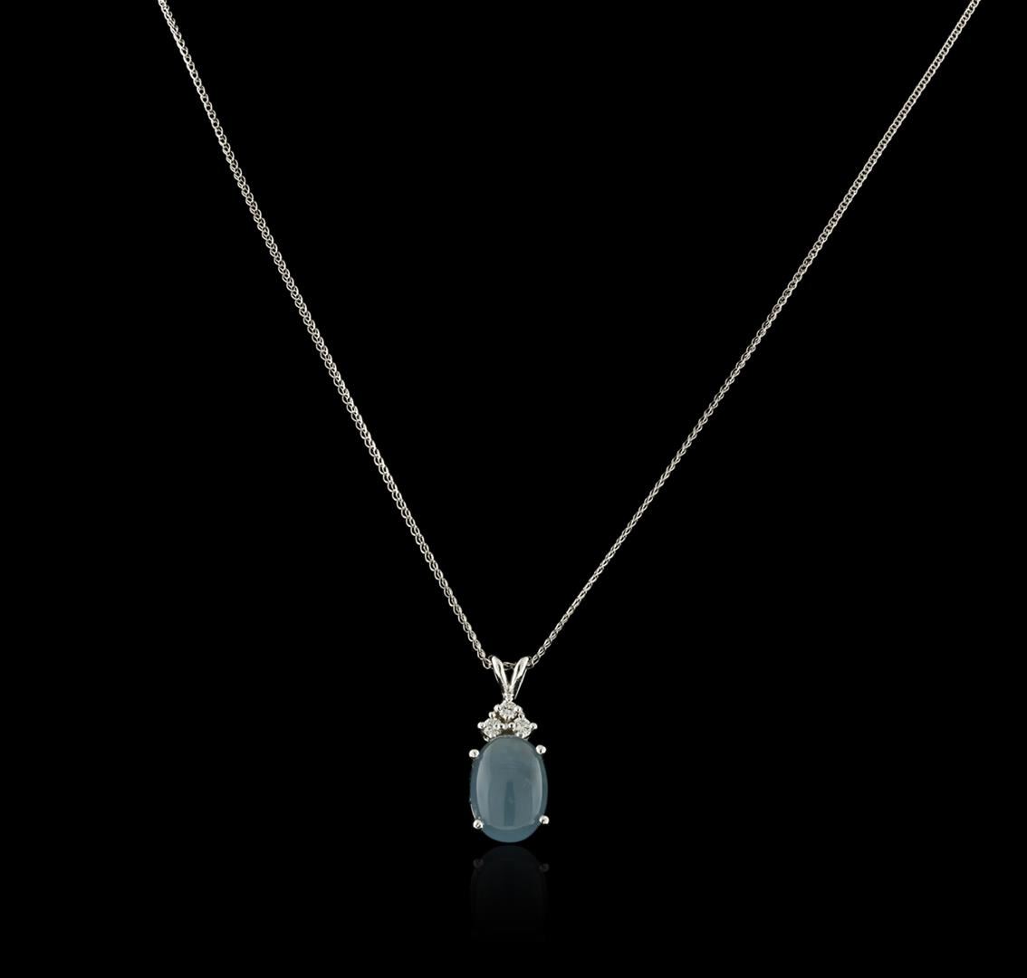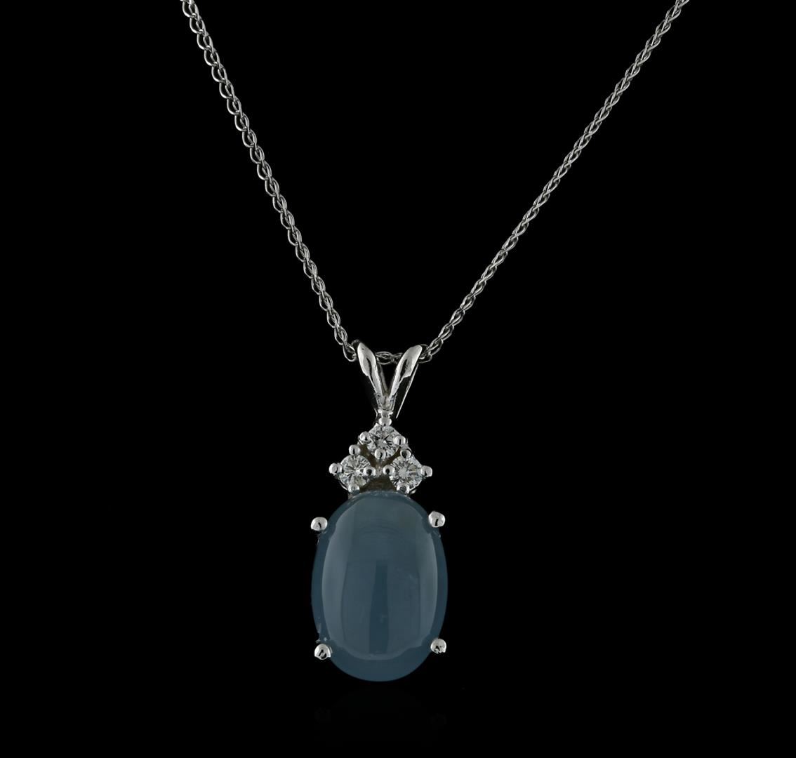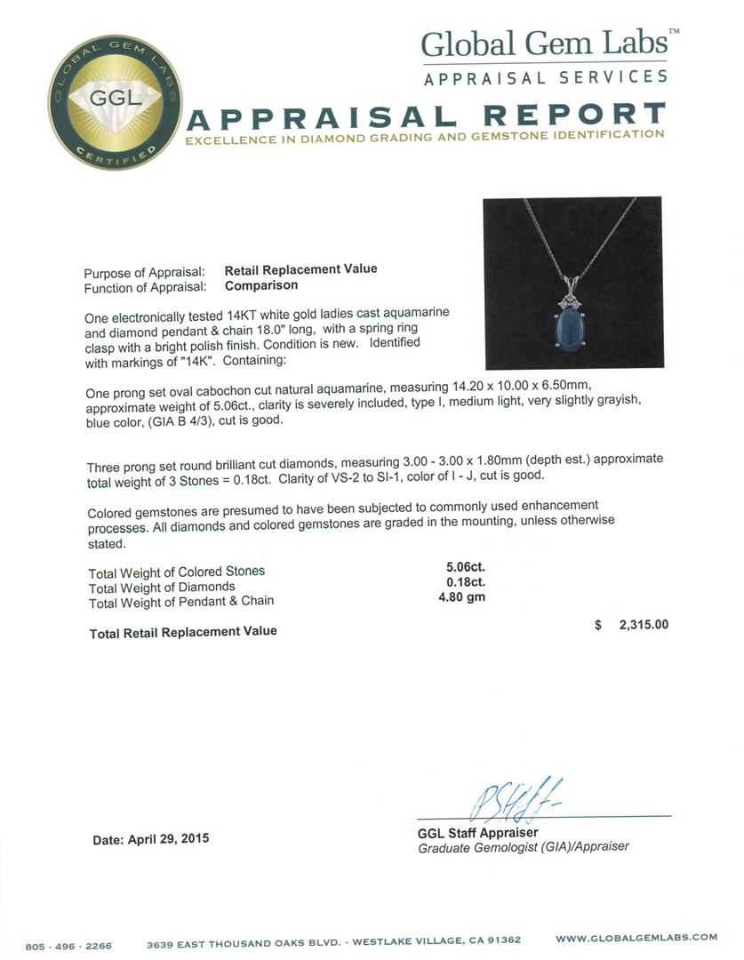 One electronically tested 14KT white gold ladies cast aquamarine and diamond pendant & chain 18.0" long, with a spring ring clasp with a bright polish finish. Identified with markings of "14K". Condition is new. Containing: One prong set oval cabochon cut natural aquamarine, measuring 14.20 x 10.00 x 6.50mm, approximate weight of 5.06ct., clarity is severely included, type I, medium light, very slightly grayish, blue color, (GIA B 4/3), cut is good. Three prong set round brilliant cut diamonds, measuring 3.00 - 3.00 x 1.80mm (depth est.) approximate total weight of 3 Stones = 0.18ct. Clarity: VS-2 to SI-1. Color: I - J, Cut is Good. Colored gemstones are presumed to have been subjected to commonly used enhancement processes. All diamonds and colored gemstones are graded in the mounting, unless otherwise stated. Total Weight of Colored Stones 5.06ct. Total Weight of Diamonds 0.18ct. Total Weight of Pendant & Chain 4.80 grams. GGL Appraised at $2,315.00.
