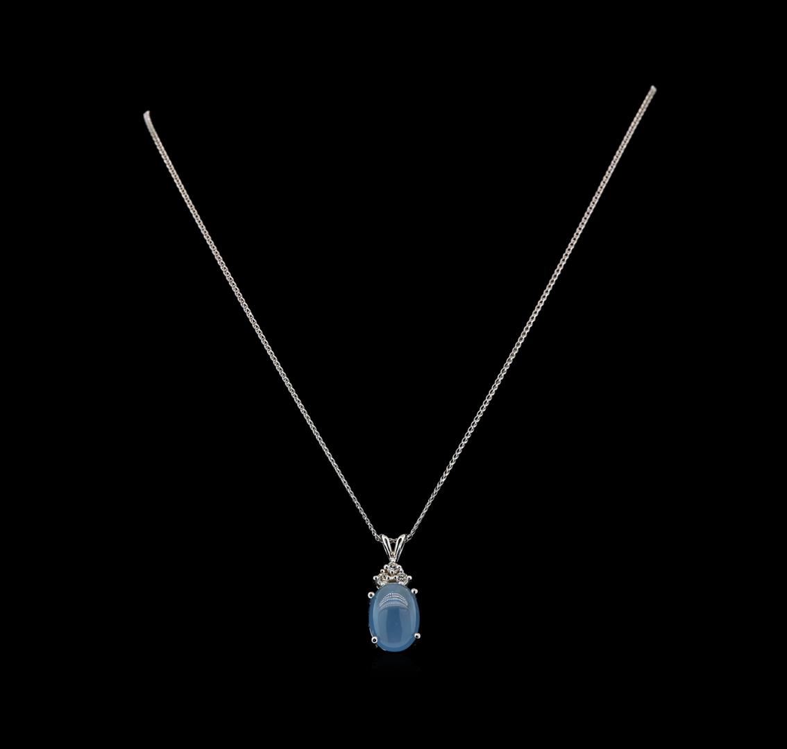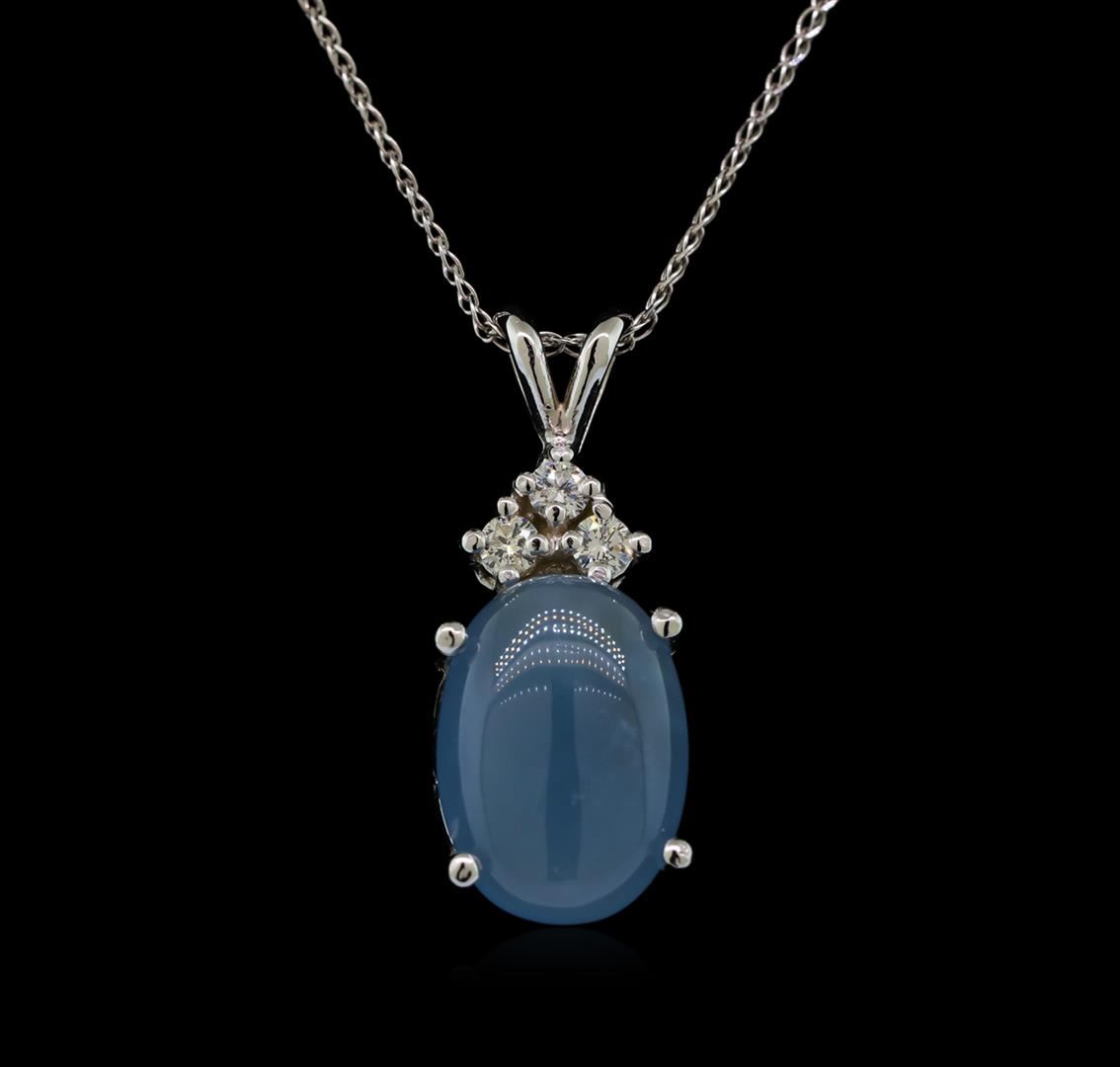 One electronically tested 14KT white gold ladies cast aquamarine and diamond pendant & chain 18.0" long, with a spring ring clasp with a bright polish finish. Identified with markings of "14K". Condition is new. Containing: One prong set oval cabochon cut natural aquamarine, measuring 14.20 x 10.00 x 6.50mm, approximate weight of 5.06ct., clarity is severely included, type I, medium light, very slightly grayish, blue color, (GIA B 4/3), cut is good. Three prong set round brilliant cut diamonds, measuring 3.00 - 3.00 x 1.80mm (depth est.) approximate total weight of 3 Stones = 0.18ct. Clarity: VS-2 to SI-1. Color: I - J, Cut is Good. Colored gemstones are presumed to have been subjected to commonly used enhancement processes. All diamonds and colored gemstones are graded in the mounting, unless otherwise stated. Total Weight of Colored Stones 5.06ct. Total Weight of Diamonds 0.18ct. Total Weight of Pendant & Chain 4.80 grams. GGL Appraised at $2,315.00.