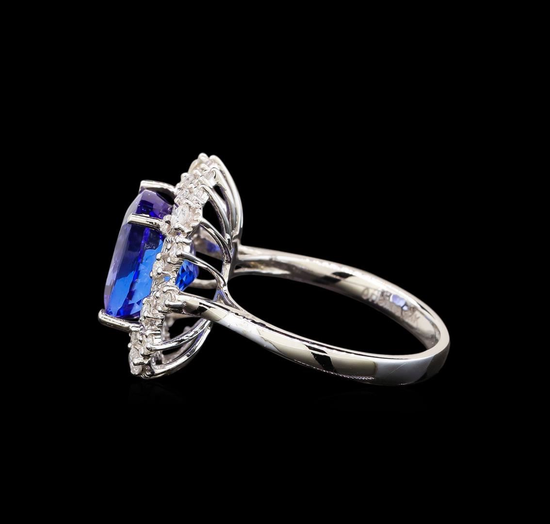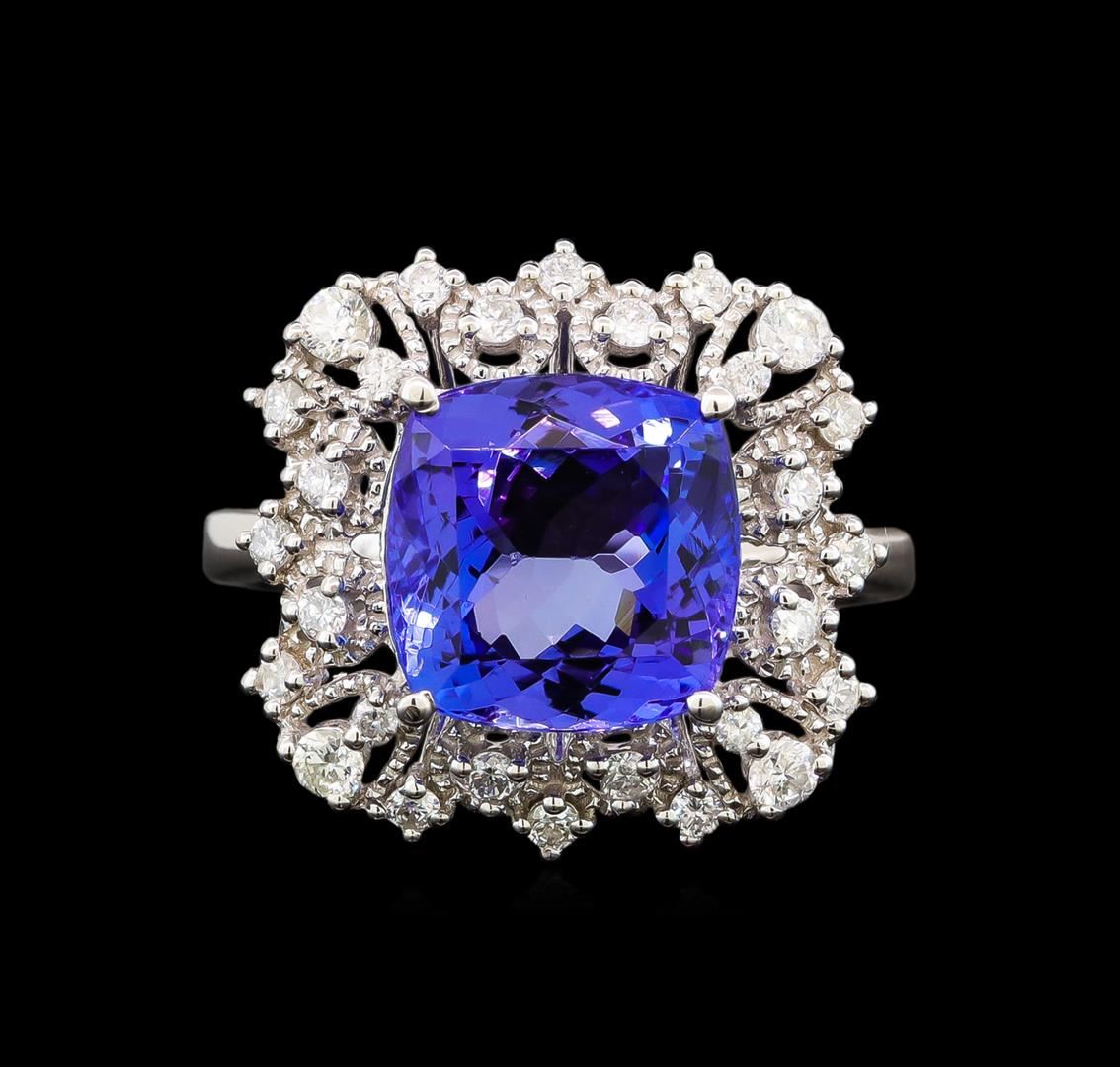 One electronically tested 14KT white gold ladies cast tanzanite and diamond ring with a flat shank with a bright polish finish. Trademark is Orianne. Identified with markings of "14K". Condition is new. Containing: One prong set square cushion modified brilliant cut natural tanzanite, measuring 10.00 x 10.00 x 6.50mm, approximate weight of 5.12ct., clarity is eye clean, type I, medium, very slightly grayish, violet color, (GIA V 5/3), cut is good. Twenty-Eight prong set round brilliant cut diamonds, measuring 1.90 - 1.20 x 0.93mm (depth est.) approximate total weight of 28 Stones = 0.38ct. Clarity: SI-2 to I-2. Color: I - J, Cut is Good. All diamonds and colored gemstones are graded in the mounting, unless otherwise stated. Colored gemstones are presumed to have been subjected to commonly used enhancement processes.. Total Weight of Colored Stones 5.12ct. Total Weight of Diamonds 0.38ct. Total Weight of Ring 4.70 grams. GGL Appraised at $4,910.00.