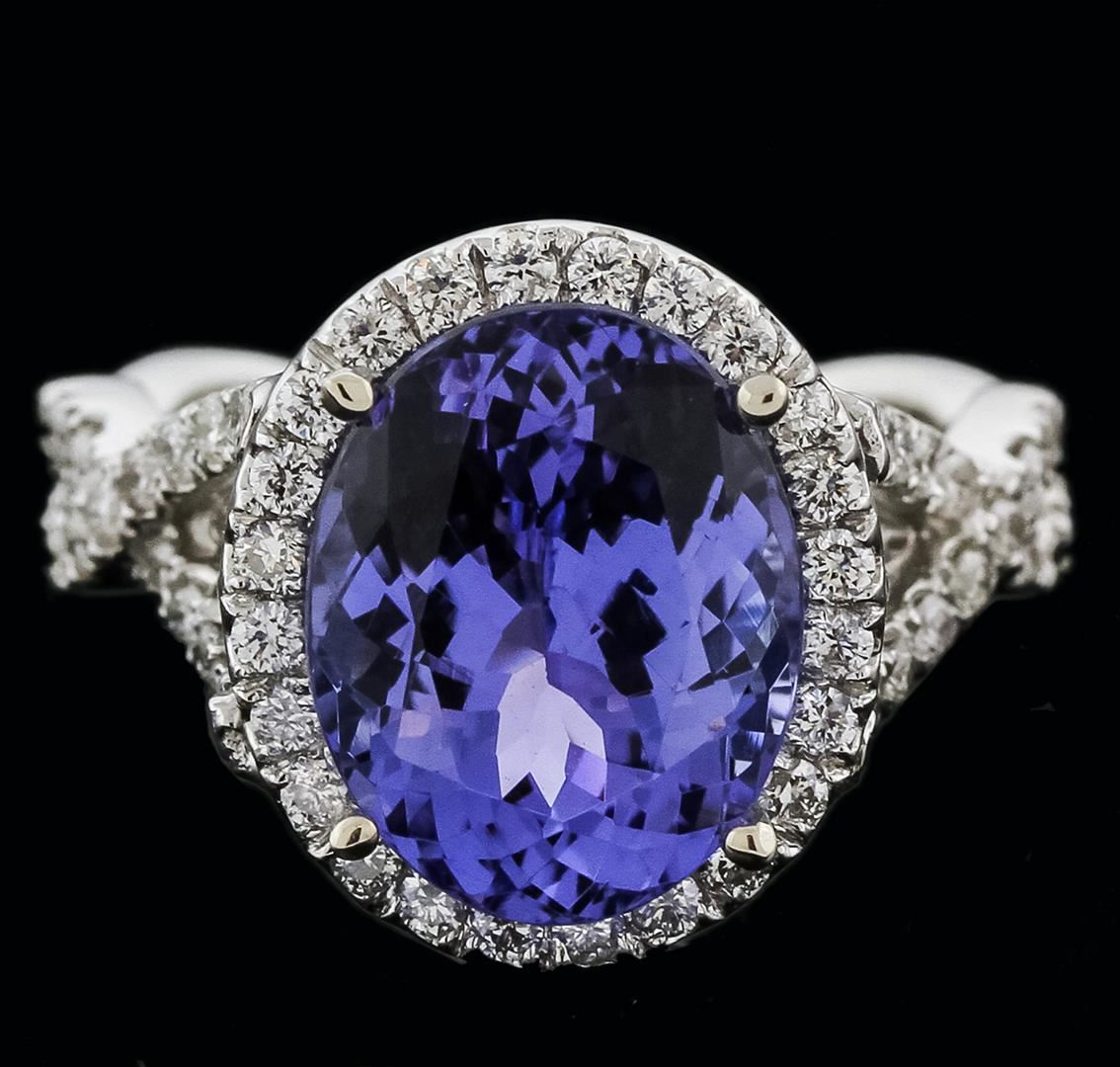 One electronically tested 14KT white gold ladies cast tanzanite and diamond ring with a bright polish finish. Identified with markings of "K14". Condition is new. Containing: One prong set oval modified brilliant cut natural tanzanite, measuring 12.40 x 9.50 x 6.18mm, approximate weight of 5.12ct., clarity is eye clean, type I, medium light, very slightly grayish, violet color, (GIA V 4/3), cut is good. Sixty-Six prong set round brilliant cut diamonds, measuring 1.30 - 1.30 x 0.78mm (depth est.) approximate. Total Weight of 66 Stones = 0.53ct. Clarity: SI-2 to I-1. Color: I - J, Cut is Good. Colored gemstones are presumed to have been subjected to commonly used enhancement processes. All diamonds and colored gemstones are graded in the mounting, unless otherwise stated. Total Weight of Colored Stones 5.12ct. Total Weight of Diamonds 0.53ct. Total Weight of Ring 7.60 grams. GGL Appraised at $5,250.00.