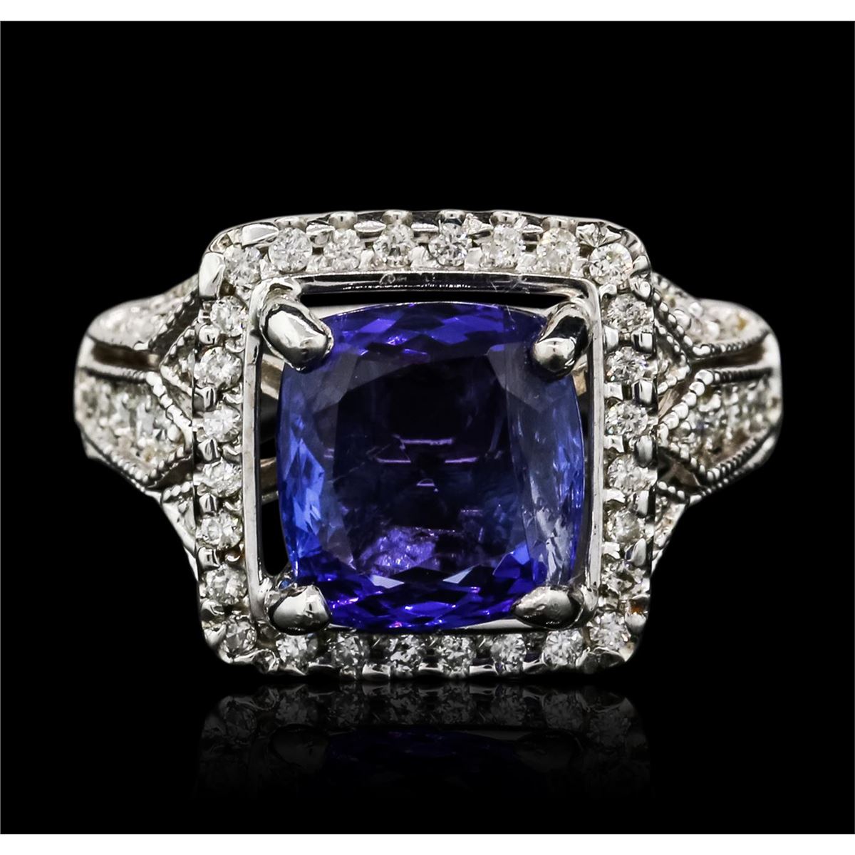 One electronically tested 14KT white gold ladies combination cast & assembled tanzanite and diamond ring with a bright polish finish. Identified with markings of "14K". Condition is new. Containing: One prong set square cushion modified brilliant cut natural tanzanite, measuring 10.00 x 10.00 x 6.50mm, approximate weight of 5.12ct., clarity is eye clean, type I, medium, moderately strong, violet color, (GIA V 5/4), cut is very good. Sixty-Six prong set round brilliant cut diamonds, measuring 2.00 - 1.30 x 0.99mm (depth est.) approximate total weight of 66 Stones = 0.80ct. Clarity: SI-1 to I-1. Color: I - J, Cut is Good. Colored gemstones are presumed to have been subjected to commonly used enhancement processes. All diamonds and colored gemstones are graded in the mounting, unless otherwise stated. Total Weight of Colored Stones 5.12ct. Total Weight of Diamonds 0.80ct. Total Weight of Ring 8.20 grams. GGL Appraised at $8,815.00.