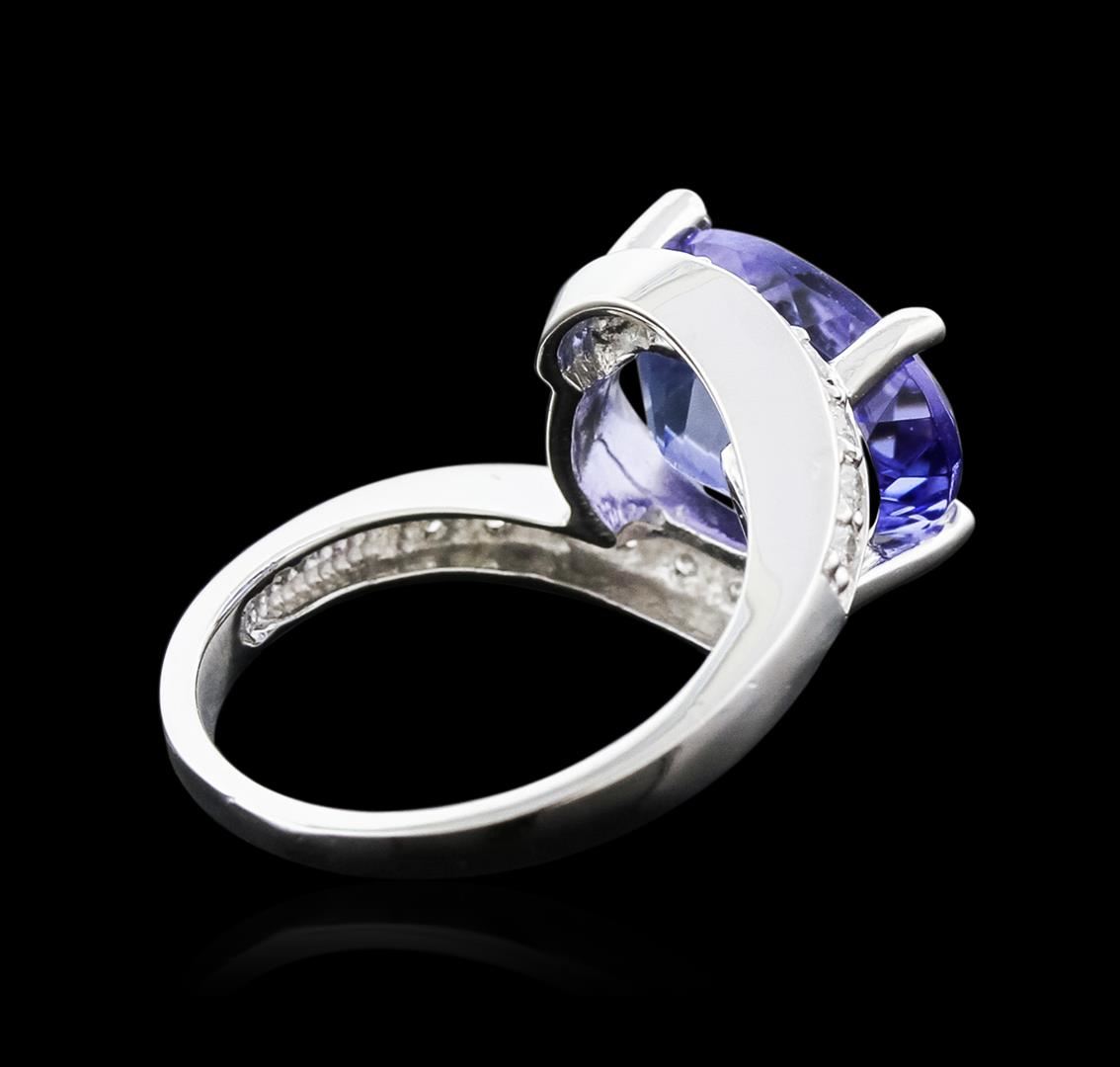 One electronically tested 14KT white gold ladies cast tanzanite and diamond ring with a bright polish finish. Condition is new. Containing: One prong set oval modified brilliant cut natural tanzanite, measuring 12.10 x 9.62 x 6.26mm, approximate weight of 5.13ct., clarity is eye clean, type I, medium light, very slightly grayish, violet color, (GIA V 4/3), cut is good. Sixteen prong set round brilliant cut diamonds, measuring 1.50 - 1.50 x 0.90mm (depth est.) approximate total weight of 16 Stones = 0.20ct. Clarity: SI-1 to SI-2. Color: I - J, Cut is Good. Colored gemstones are presumed to have been subjected to commonly used enhancement processes. All diamonds and colored gemstones are graded in the mounting, unless otherwise stated. Total Weight of Colored Stones 5.13ct. Total Weight of Diamonds 0.20ct. Total Weight of Ring 6.00 grams. GGL Appraised at $5,265.00.