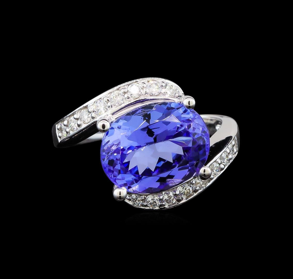 One electronically tested 14KT white gold ladies cast tanzanite and diamond ring with a bright polish finish. Condition is new. Containing: One prong set oval modified brilliant cut natural tanzanite, measuring 12.10 x 9.62 x 6.26mm, approximate weight of 5.13ct., clarity is eye clean, type I, medium light, very slightly grayish, violet color, (GIA V 4/3), cut is good. Sixteen prong set round brilliant cut diamonds, measuring 1.50 - 1.50 x 0.90mm (depth est.) approximate total weight of 16 Stones = 0.20ct. Clarity: SI-1 to SI-2. Color: I - J, Cut is Good. Colored gemstones are presumed to have been subjected to commonly used enhancement processes. All diamonds and colored gemstones are graded in the mounting, unless otherwise stated. Total Weight of Colored Stones 5.13ct. Total Weight of Diamonds 0.20ct. Total Weight of Ring 6.00 grams. GGL Appraised at $5,265.00.