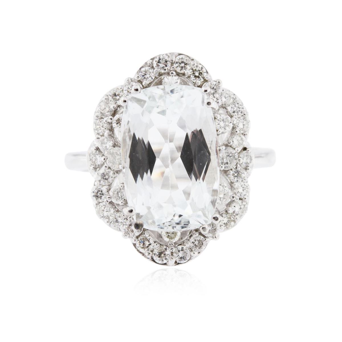 One electronically tested 14KT white gold ladies cast aquamarine and diamond ring with a bright polish finish. Identified with markings of "K14". Condition is new. Containing: One prong set rectangular cushion modified mixed cut natural aquamarine, measuring 13.37 x 8.96 x 6.70mm, approximate weight of 5.13ct., clarity is eye clean, type I, very light, slightly grayish, blue color, (GIA B 2/2), cut is good. Thirty-Nine prong set round brilliant cut diamonds, measuring 2.00 - 1.50 x 1.05mm (depth est.) approximate total weight of 39 Stones = 0.76ct. Clarity: SI-1 to I-1. Color: I - J, Cut is Good. Colored gemstones are presumed to have been subjected to commonly used enhancement processes. All diamonds and colored gemstones are graded in the mounting, unless otherwise stated. Total Weight of Colored Stones 5.13ct. Total Weight of Diamonds 0.76ct. Total Weight of Ring 6.20 grams. GGL Appraised at $3,910.00.
