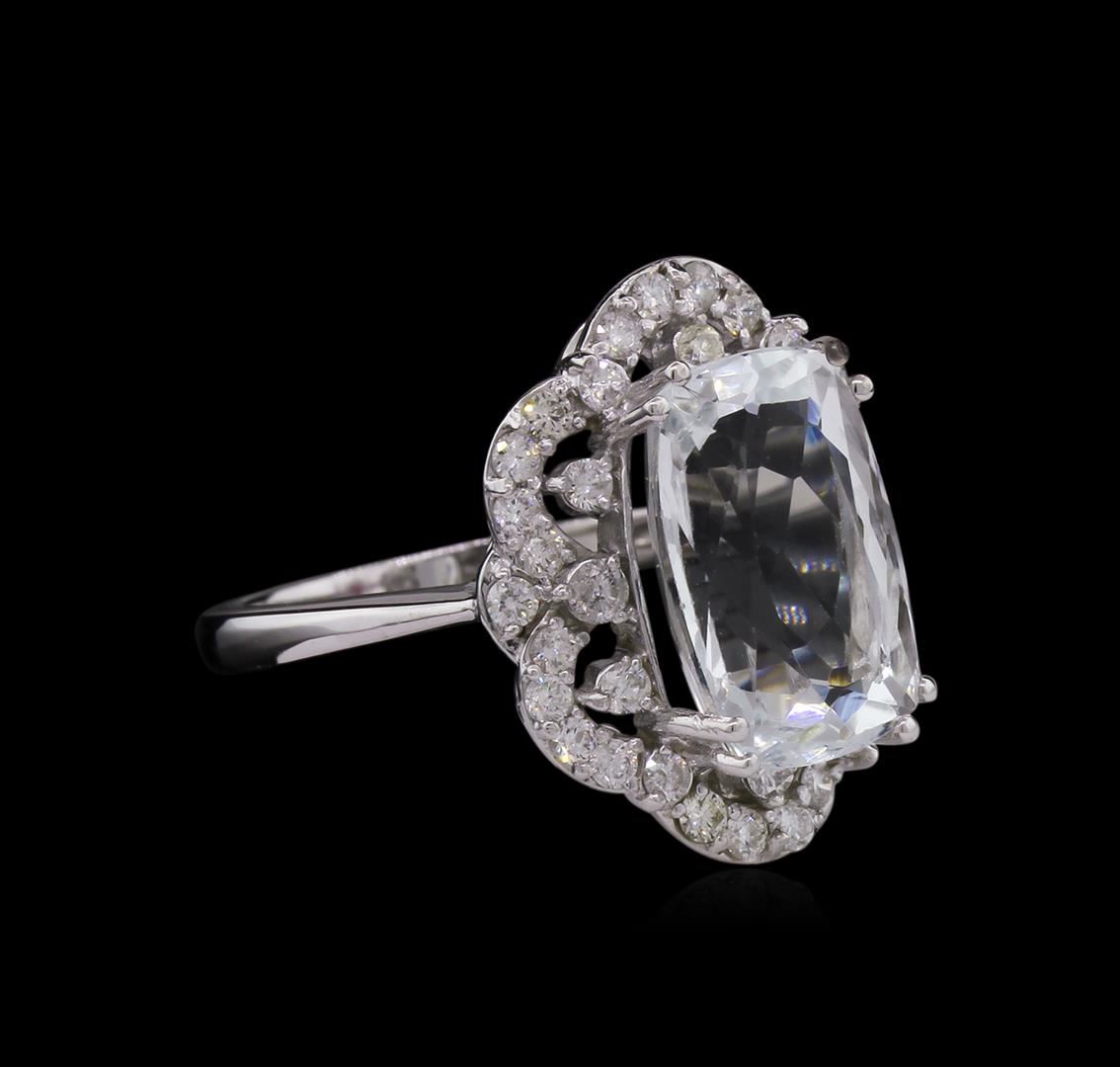 One electronically tested 14KT white gold ladies cast aquamarine and diamond ring with a bright polish finish. Identified with markings of "K14". Condition is new. Containing: One prong set rectangular cushion modified mixed cut natural aquamarine, measuring 13.37 x 8.96 x 6.70mm, approximate weight of 5.13ct., clarity is eye clean, type I, very light, slightly grayish, blue color, (GIA B 2/2), cut is good. Thirty-Nine prong set round brilliant cut diamonds, measuring 2.00 - 1.50 x 1.05mm (depth est.) approximate total weight of 39 Stones = 0.76ct. Clarity: SI-1 to I-1. Color: I - J, Cut is Good. Colored gemstones are presumed to have been subjected to commonly used enhancement processes. All diamonds and colored gemstones are graded in the mounting, unless otherwise stated. Total Weight of Colored Stones 5.13ct. Total Weight of Diamonds 0.76ct. Total Weight of Ring 6.20 grams. GGL Appraised at $3,910.00.