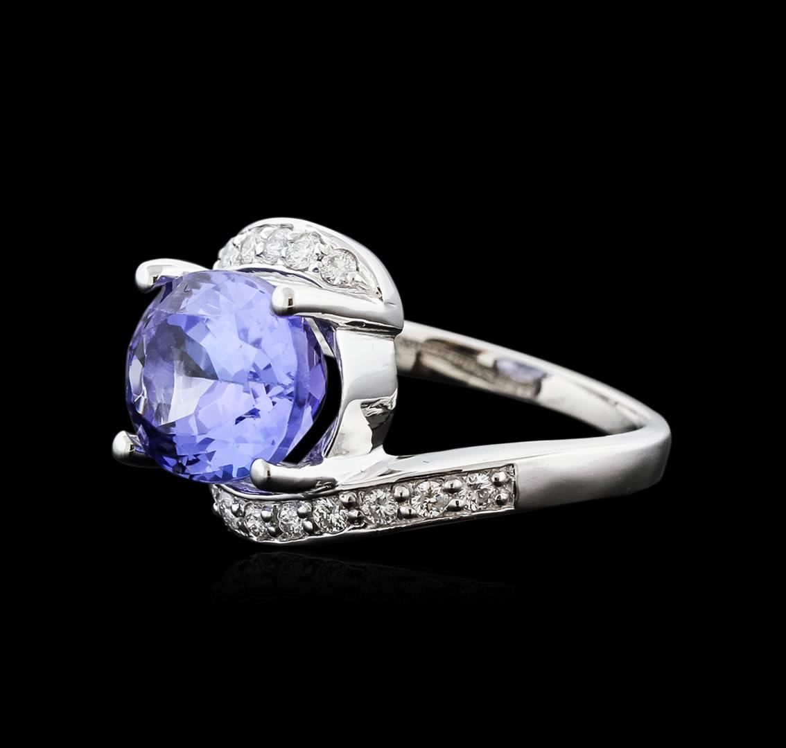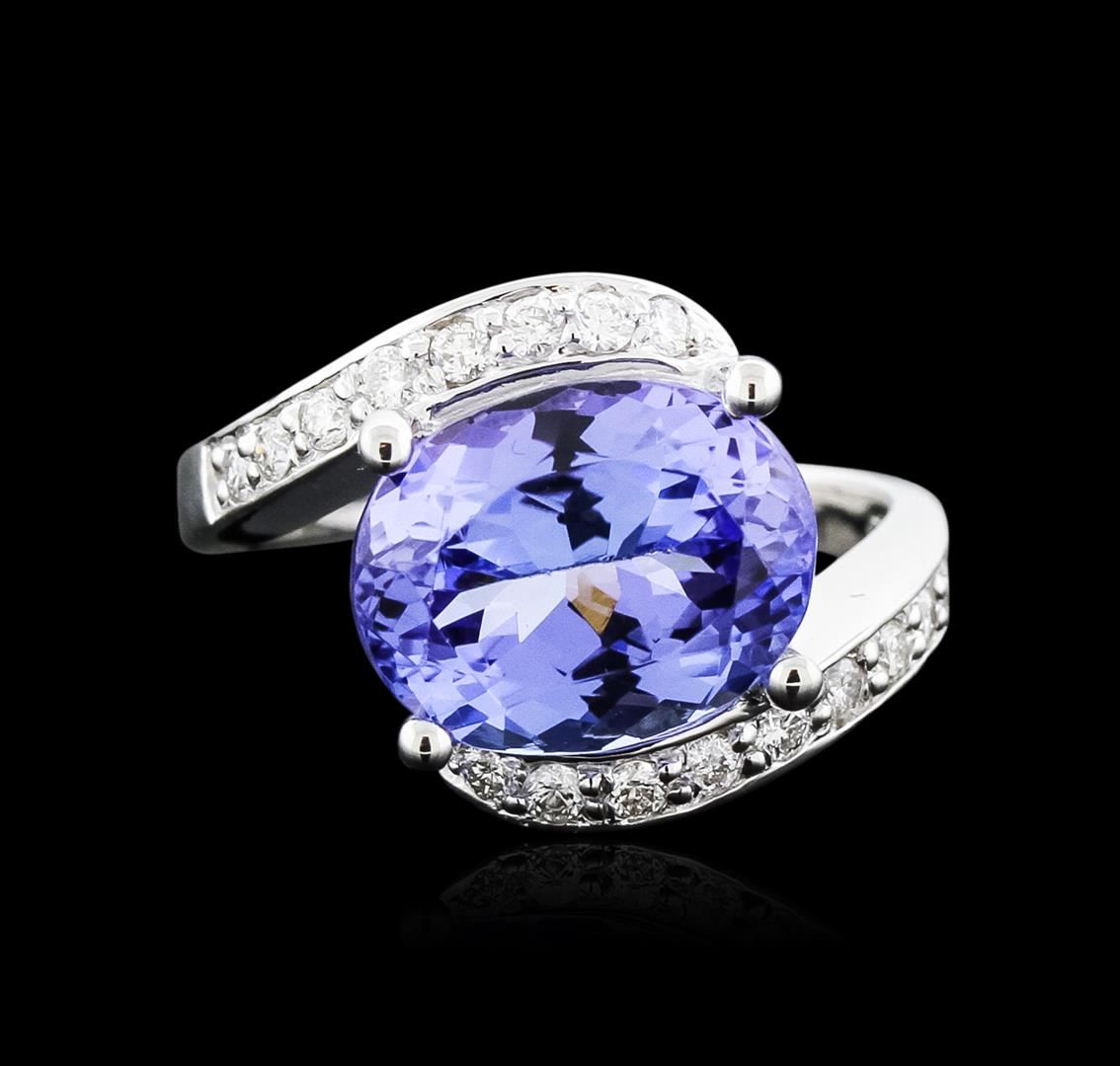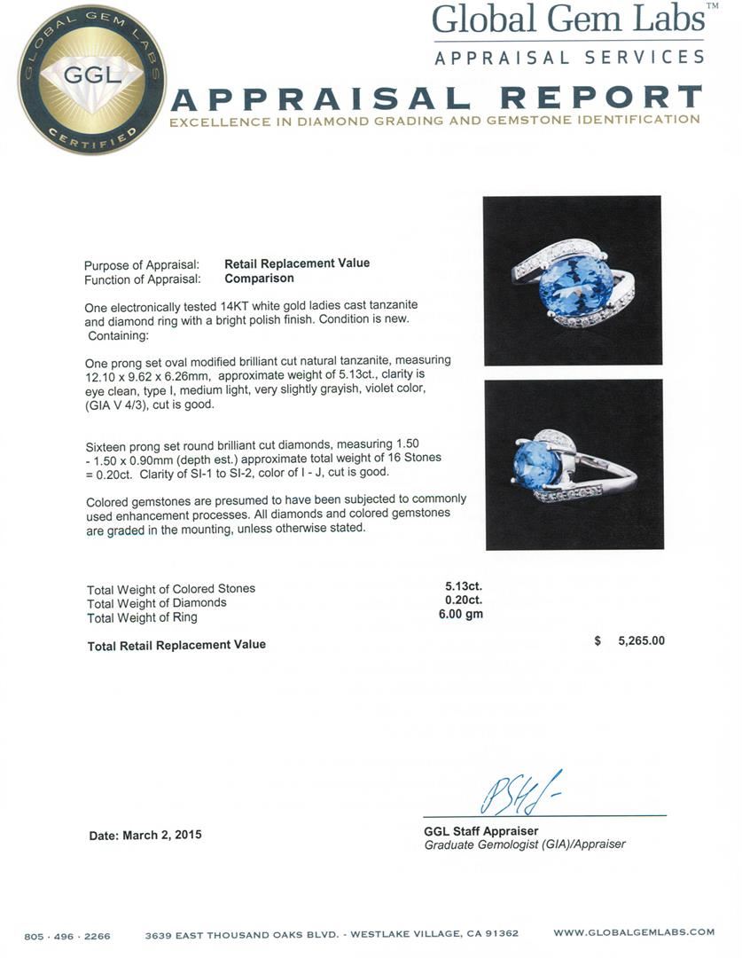 One electronically tested 14KT white gold ladies cast tanzanite and diamond ring with a bright polish finish. Condition is new. Containing: One prong set oval modified brilliant cut natural tanzanite, measuring 12.10 x 9.62 x 6.26mm, approximate weight of 5.13ct., clarity is eye clean, type I, medium light, very slightly grayish, violet color, (GIA V 4/3), cut is good. Sixteen prong set round brilliant cut diamonds, measuring 1.50 - 1.50 x 0.90mm (depth est.) approximate total weight of 16 Stones = 0.20ct. Clarity: SI-1 to SI-2. Color: I - J, Cut is Good. Colored gemstones are presumed to have been subjected to commonly used enhancement processes. All diamonds and colored gemstones are graded in the mounting, unless otherwise stated. Total Weight of Colored Stones 5.13ct. Total Weight of Diamonds 0.20ct. Total Weight of Ring 6.00 grams. GGL Appraised at $5,265.00.