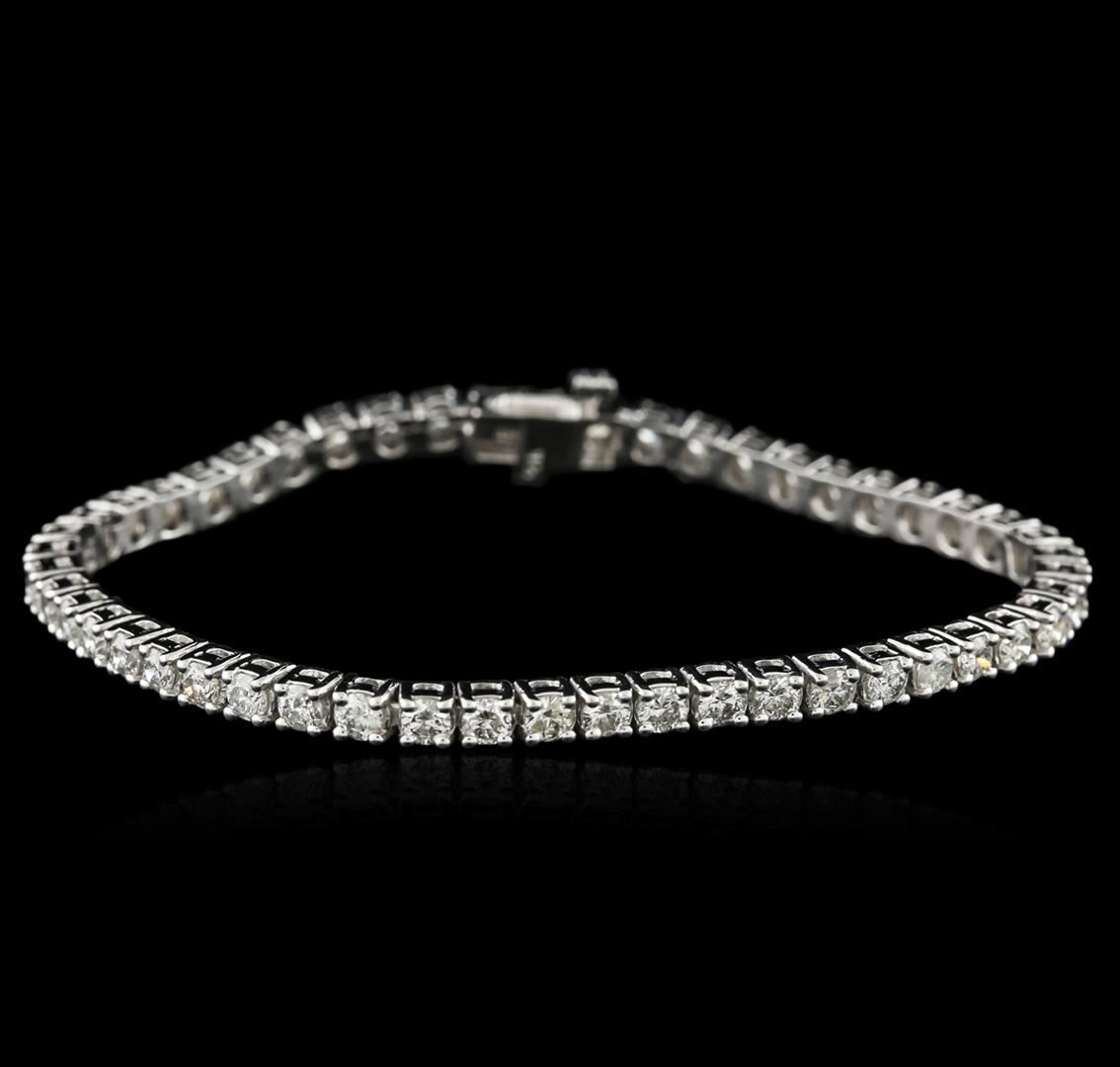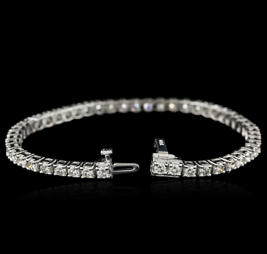 One electronically tested 14KT white gold ladies cast diamond tennis bracelet with a hidden box clasp with safety closer with a bright polish finish. Measurements: 7". Identified with markings of "14K". Condition is new. Containing: Fifty prong set round brilliant cut diamonds, measuring 3.00 - 3.00 x 1.80mm (depth est.) approximate total weight of 50 Stones = 5.13ct. Clarity: SI-2 to I-2. Color: H - J, Cut is Good. Diamonds are graded in the mounting, unless otherwise stated. Total Weight of Diamonds 5.13ct. Total Weight of Tennis Bracelet 13.60 grams. GGL Appraised at $9,810.00.
