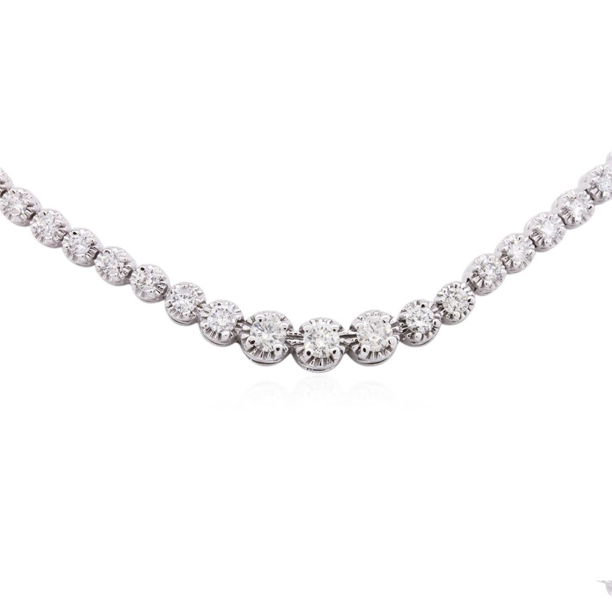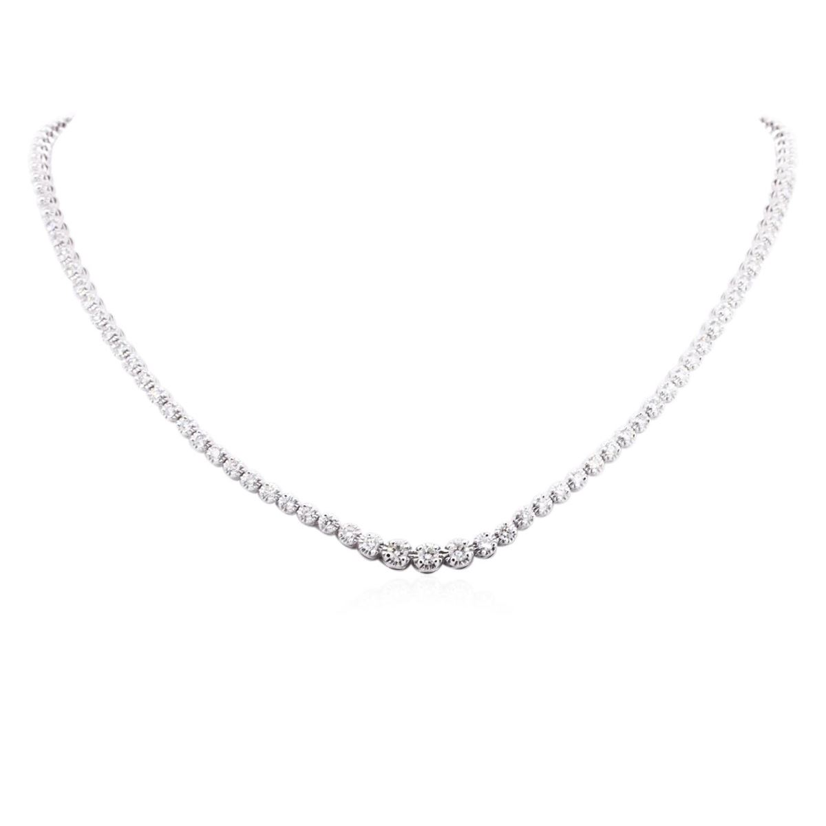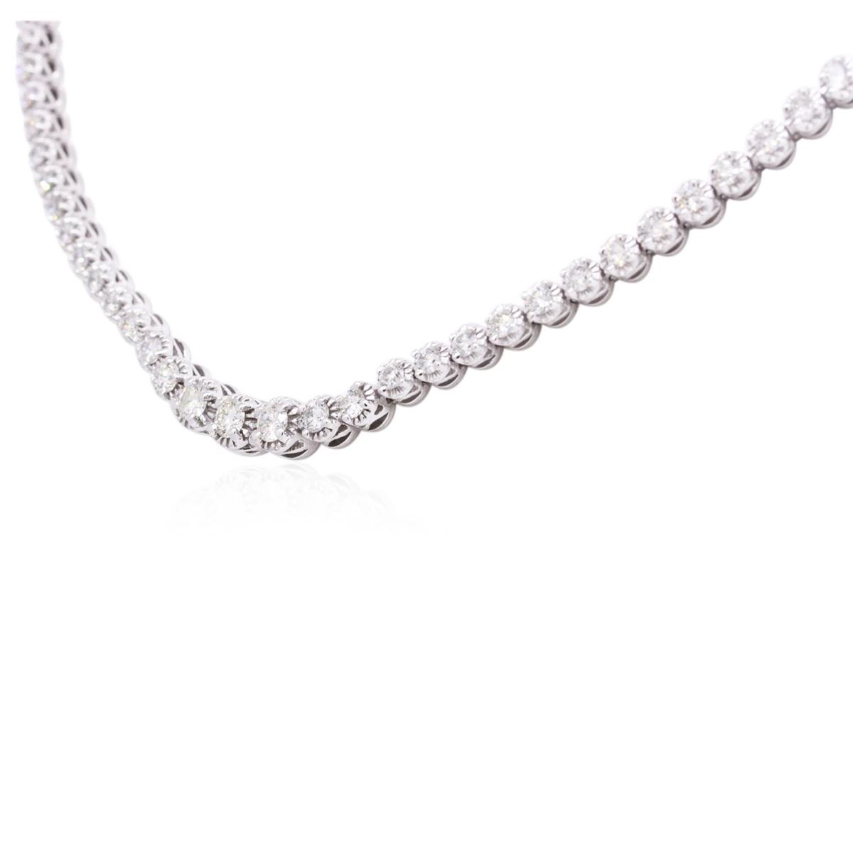 One electronically tested 14KT white gold ladies cast diamond necklace with a hidden box clasp with safety closer with a bright polish finish. Measurements: 17" in length Identified with markings of "14K". Condition is new. Containing: Fifty-Two prong set round brilliant cut diamonds, measuring 3.50 - 2.50 x 1.80mm (depth est.) approximate total weight of 52 Stones = 5.14ct. Clarity: SI-2 to I-1. Color: I - K, Cut is Good. All diamonds are graded in the mounting, unless otherwise stated. Total Weight of Diamonds 5.14ct. Total Weight of Necklace 28.00 grams. GGL Appraised at $19,080.00.