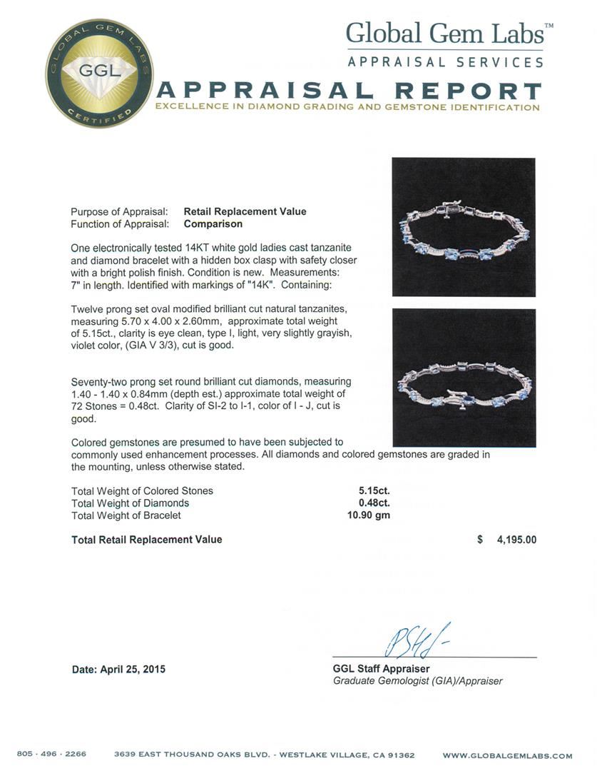 One electronically tested 14KT white gold ladies cast tanzanite and diamond bracelet with a hidden box clasp with safety closer with a bright polish finish. Measurements: 7" in length. Identified with markings of "14K". Condition is new. Containing: Twelve prong set oval modified brilliant cut natural tanzanites, measuring 5.70 x 4.00 x 2.60mm, approximate total weight of 5.15ct., clarity is eye clean, type I, light, very slightly grayish, violet color, (GIA V 3/3), cut is good. Seventy-Two prong set round brilliant cut diamonds, measuring 1.40 - 1.40 x 0.84mm (depth est.) approximate total weight of 72 Stones = 0.48ct. Clarity: SI-2 to I-1. Color: I - J, Cut is Good. Colored gemstones are presumed to have been subjected to commonly used enhancement processes. All diamonds and colored gemstones are graded in the mounting, unless otherwise stated. Total Weight of Colored Stones 5.15ct. Total Weight of Diamonds 0.48ct. Total Weight of Bracelet 10.90 grams. GGL Appraised at $4,195.00.