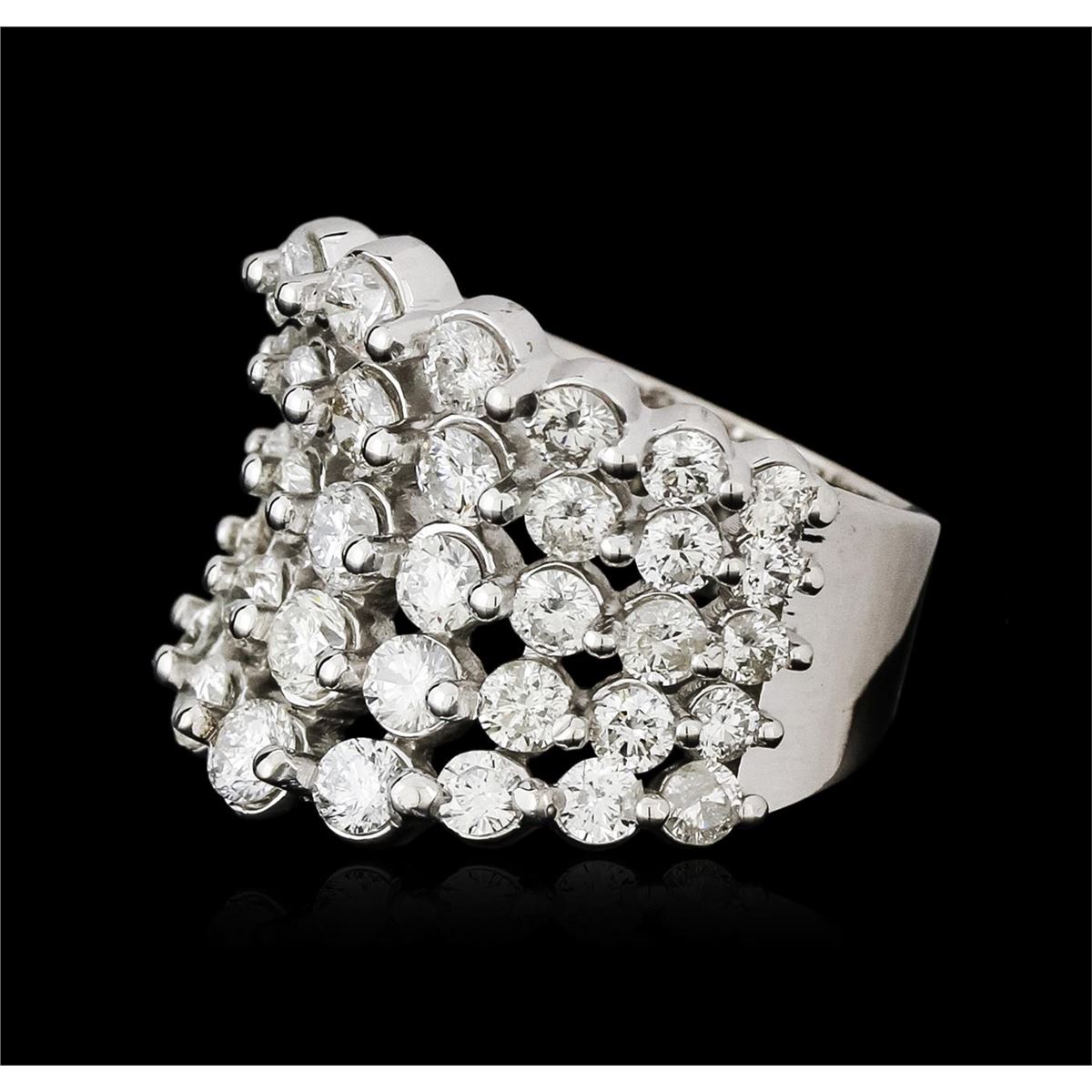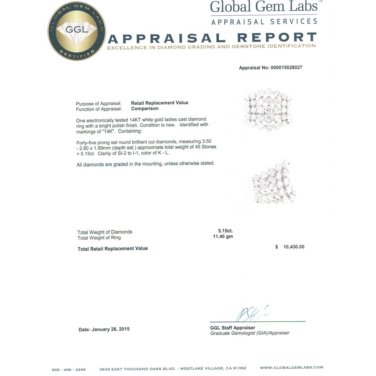 One electronically tested 14KT white gold ladies cast diamond ring with a bright polish finish. Identified with markings of "14K". Condition is new. Containing: Forty-Five prong set round brilliant cut diamonds, measuring 3.50 - 2.80 x 1.89mm (depth est.) GGL Appraised at $10,430.00.