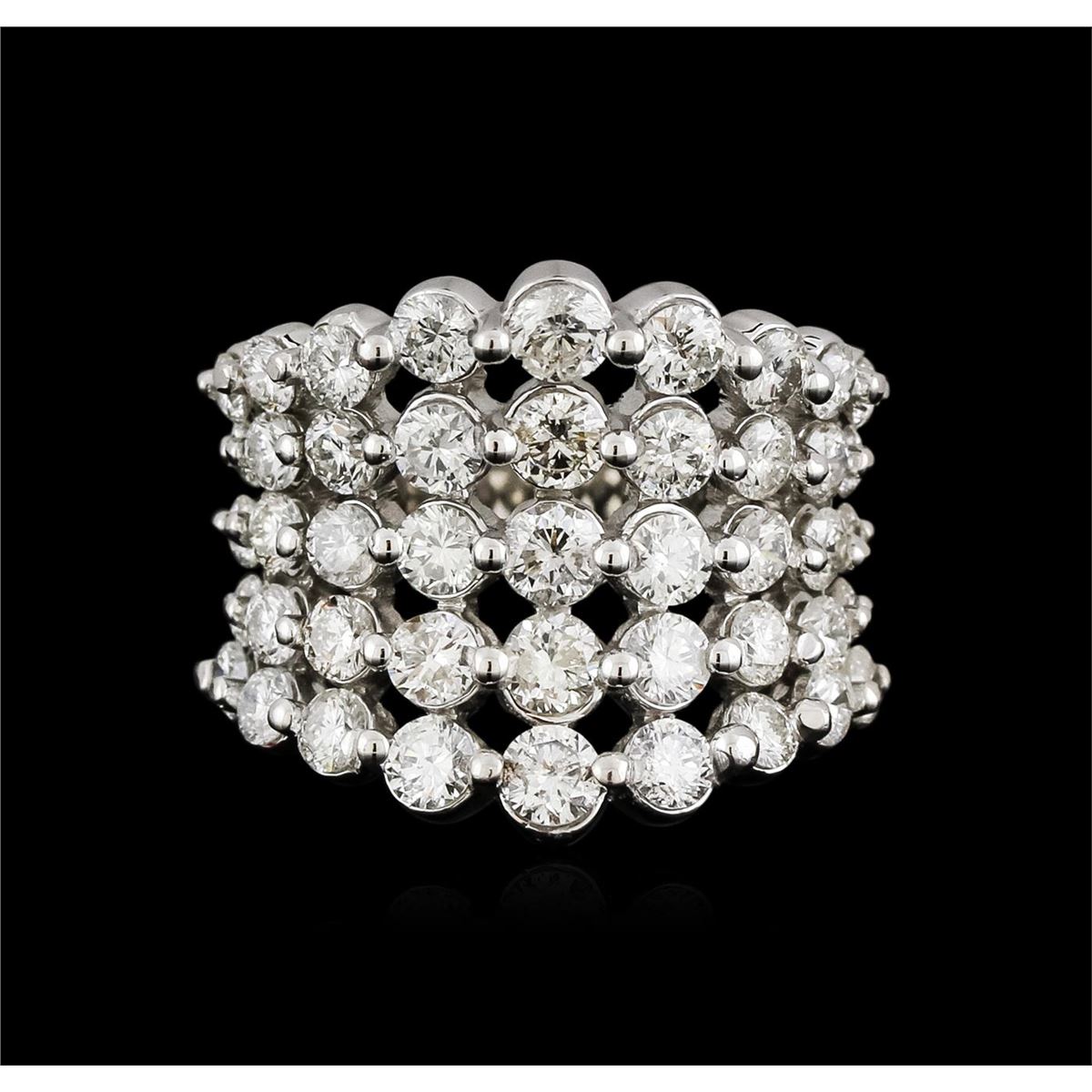 One electronically tested 14KT white gold ladies cast diamond ring with a bright polish finish. Identified with markings of "14K". Condition is new. Containing: Forty-Five prong set round brilliant cut diamonds, measuring 3.50 - 2.80 x 1.89mm (depth est.) GGL Appraised at $10,430.00.