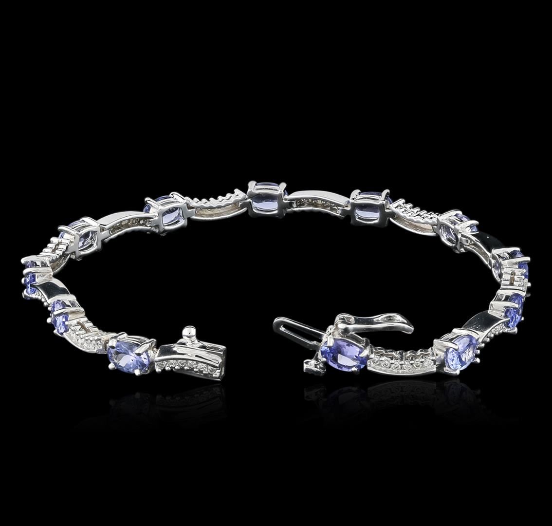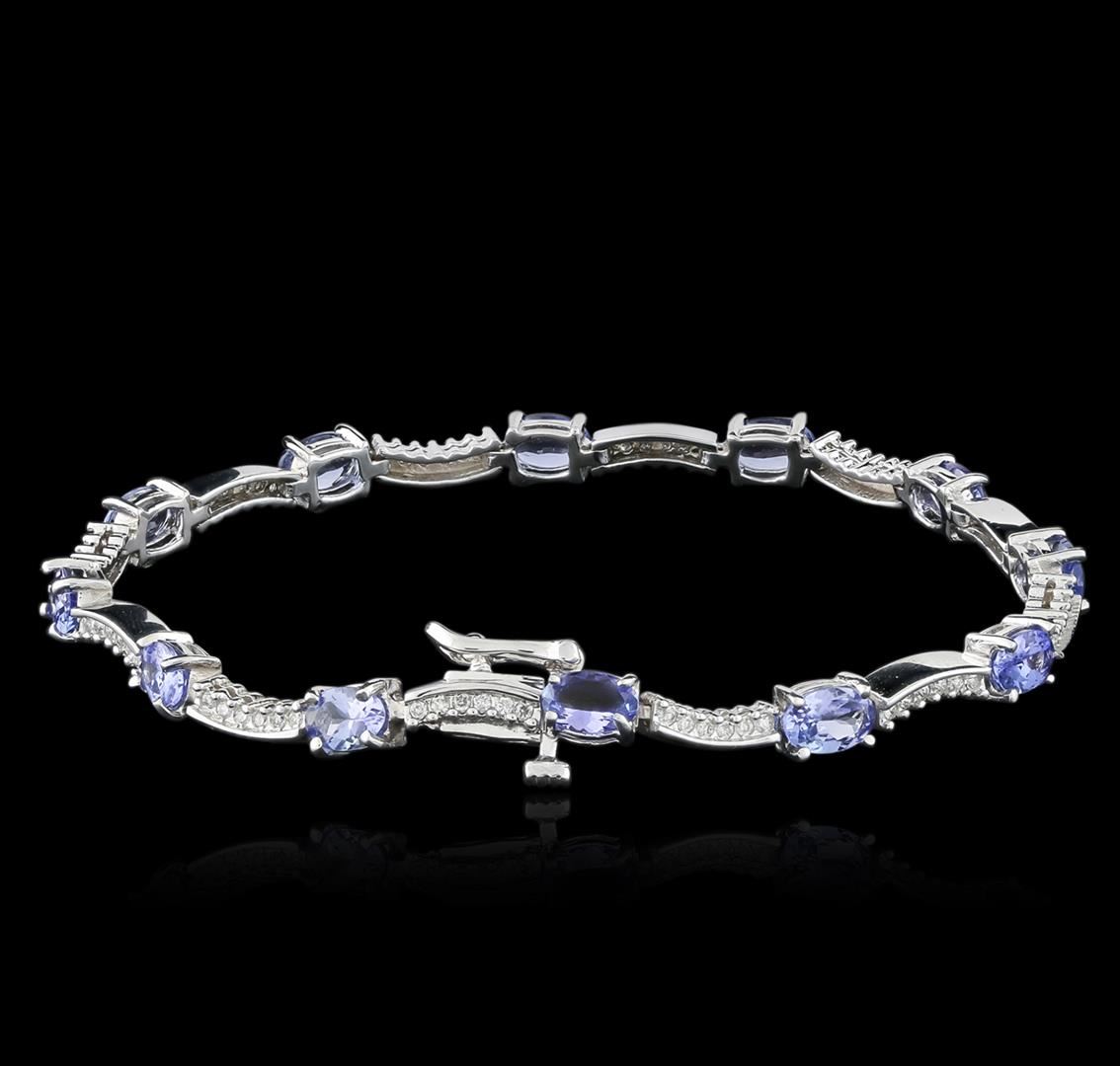 One electronically tested 14KT white gold ladies cast tanzanite and diamond bracelet with a hidden box clasp with safety closer with a bright polish finish. Measurements: 7" in length. Identified with markings of "14K". Condition is new. Containing: Twelve prong set oval modified brilliant cut natural tanzanites, measuring 5.70 x 4.00 x 2.60mm, approximate total weight of 5.15ct., clarity is eye clean, type I, light, very slightly grayish, violet color, (GIA V 3/3), cut is good. Seventy-Two prong set round brilliant cut diamonds, measuring 1.40 - 1.40 x 0.84mm (depth est.) approximate total weight of 72 Stones = 0.48ct. Clarity: SI-2 to I-1. Color: I - J, Cut is Good. Colored gemstones are presumed to have been subjected to commonly used enhancement processes. All diamonds and colored gemstones are graded in the mounting, unless otherwise stated. Total Weight of Colored Stones 5.15ct. Total Weight of Diamonds 0.48ct. Total Weight of Bracelet 10.90 grams. GGL Appraised at $4,195.00.