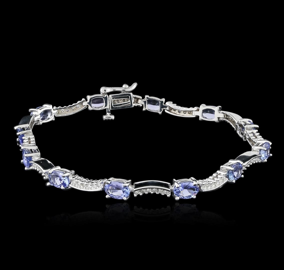 One electronically tested 14KT white gold ladies cast tanzanite and diamond bracelet with a hidden box clasp with safety closer with a bright polish finish. Measurements: 7" in length. Identified with markings of "14K". Condition is new. Containing: Twelve prong set oval modified brilliant cut natural tanzanites, measuring 5.70 x 4.00 x 2.60mm, approximate total weight of 5.15ct., clarity is eye clean, type I, light, very slightly grayish, violet color, (GIA V 3/3), cut is good. Seventy-Two prong set round brilliant cut diamonds, measuring 1.40 - 1.40 x 0.84mm (depth est.) approximate total weight of 72 Stones = 0.48ct. Clarity: SI-2 to I-1. Color: I - J, Cut is Good. Colored gemstones are presumed to have been subjected to commonly used enhancement processes. All diamonds and colored gemstones are graded in the mounting, unless otherwise stated. Total Weight of Colored Stones 5.15ct. Total Weight of Diamonds 0.48ct. Total Weight of Bracelet 10.90 grams. GGL Appraised at $4,195.00.
